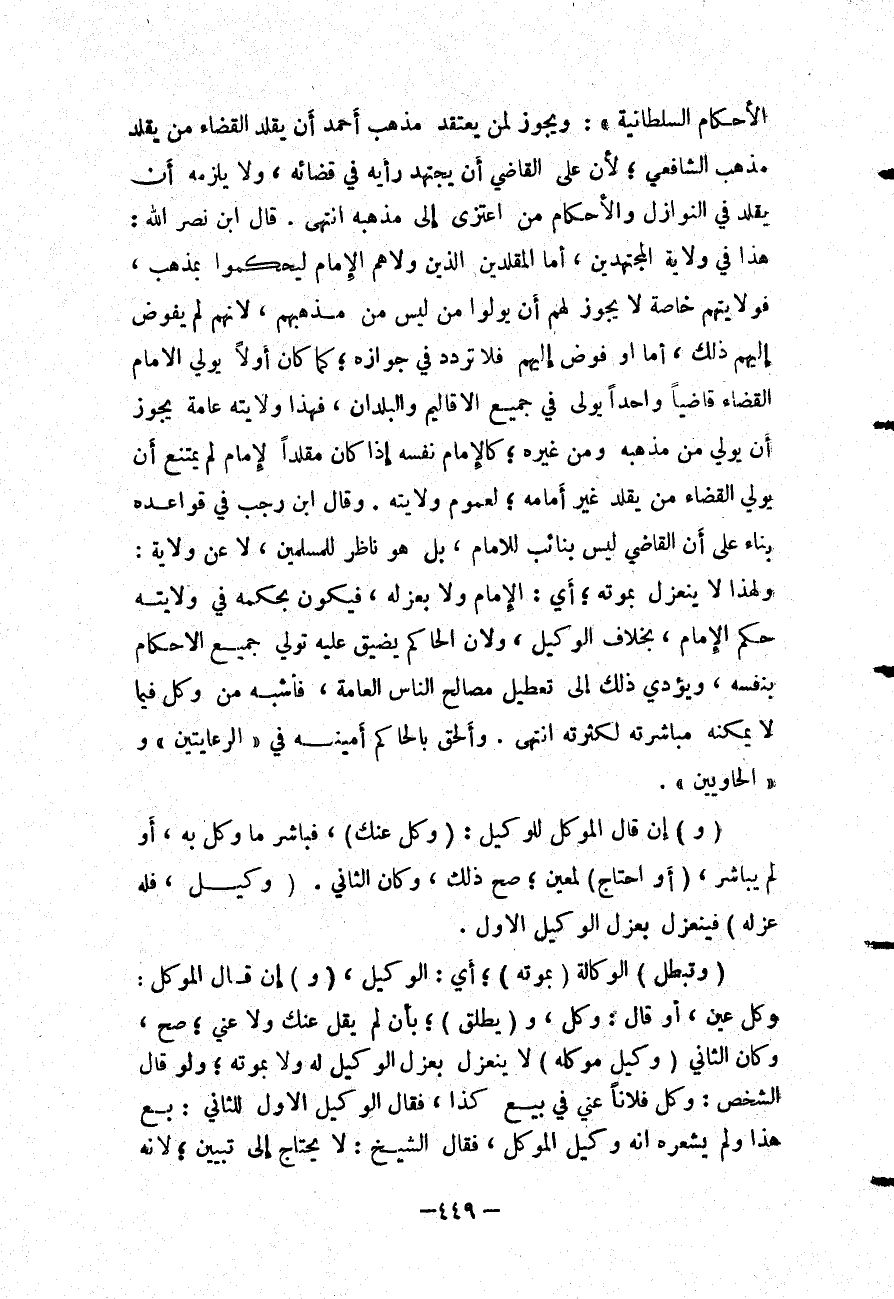 الْأَحْكَامِ السُّلْطَانِيَّةِ ": وَيَجُوزُ لِمَنْ يَعْتَقِدُ مَذْهَبَ أَحْمَدَ أَنْ يُقَلِّدَ الْقَضَاءَ مَنْ يُقَلِّدُ مَذْهَبَ الشَّافِعِيِّ؛ لِأَنَّ عَلَى الْقَاضِي أَنْ يَجْتَهِدَ رَأْيَهُ فِي قَضَائِهِ، وَلَا يَلْزَمُهُ أَنْ يُقَلِّدَ فِي النَّوَازِلِ وَالْأَحْكَامِ مَنْ اعْتَزَى إلَى مَذْهَبِهِ انْتَهَى. قَالَ ابْنُ نَصْرِ اللَّهِ: هَذَا فِي وِلَايَةِ الْمُجْتَهِدِينَ، أَمَّا الْمُقَلِّدِينَ الَّذِينَ وَلَّاهُمْ الْإِمَامُ لِيَحْكُمُوا بِمَذْهَبٍ، فَوِلَايَتُهُمْ خَاصَّةٌ لَا يَجُوزُ لَهُمْ أَنْ يُوَلُّوا مَنْ لَيْسَ مِنْ مَذْهَبِهِمْ؛ لِأَنَّهُمْ لَمْ يُفَوَّضْ إلَيْهِمْ ذَلِكَ، أَمَّا أَوْ فُوِّضَ إلَيْهِمْ فَلَا تَرَدُّدَ فِي جَوَازِهِ؛ كَمَا كَانَ أَوَّلًا يُوَلِّي الْإِمَامُ الْقَضَاءَ قَاضِيًا وَاحِدًا يُوَلِّي فِي جَمِيعِ الْأَقَالِيمِ وَالْبُلْدَانِ، فَهَذَا وِلَايَتُهُ عَامَّةٌ يَجُوزُ أَنْ يُوَلِّيَ مِنْ مَذْهَبِهِ وَمِنْ غَيْرِهِ؛ كَالْإِمَامِ نَفْسِهِ إذَا كَانَ مُقَلِّدًا لِإِمَامٍ لَمْ يَمْتَنِعْ أَنْ يُوَلِّيَ الْقَضَاءَ مَنْ يُقَلِّدُ غَيْرَ أَمَامِهِ؛ لِعُمُومِ وِلَايَتِهِ.