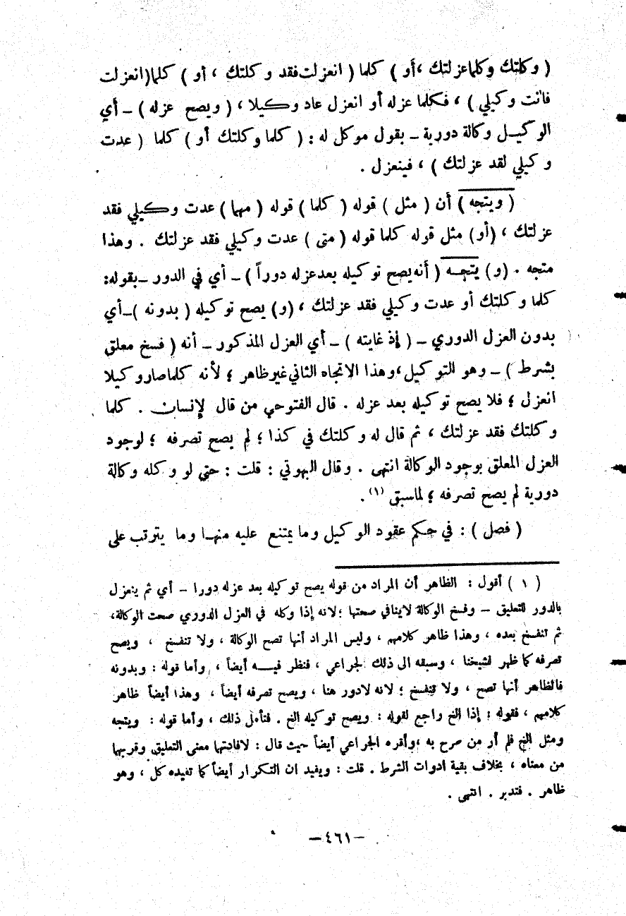 (وَكَّلْتُك وَكُلَّمَا عَزَلْتُك، أَوْ) كُلَّمَا (انْعَزَلْت فَقَدْ وَكَّلْتُك، أَوْ) كُلَّمَا (انْعَزَلْت فَأَنْتَ وَكِيلِي) ، فَكُلَّمَا عَزَلَهُ أَوْ انْعَزَلَ عَادَ وَكِيلًا، (وَيَصِحُّ عَزْلُهُ) - أَيْ الْوَكِيلِ وَكَالَةً دَوْرِيَّةً - بِقَوْلِ مُوَكِّلٍ لَهُ: (كُلَّمَا وَكَّلْتُك أَوْ) كُلَّمَا (عُدْت وَكِيلِي لَقَدْ عَزَلْتُك) ، فَيَنْعَزِلُ (وَيَتَّجِهُ) أَنَّ (مِثْلَ) قَوْلِهِ (كُلَّمَا) قَوْلُهُ (مَهْمَا) عُدْت وَكِيلِي فَقَدْ عَزَلْتُك (أَوْ) مِثْلُ قَوْلِهِ: كُلَّمَا، قَوْلُهُ (مَتَى) عُدْت وَكِيلِي فَقَدْ عَزَلْتُك وَهَذَا مُتَّجِهٌ. (وَ) يَتَّجِهُ (أَنَّهُ يَصِحُّ تَوْكِيلٌ بَعْدَ عَزْلِهِ دُورًا) - أَيْ فِي الدُّورِ - بِقَوْلِهِ: كُلَّمَا وَكَّلْتُك أَوْ عُدْت وَكِيلِي فَقَدْ عَزَلْتُك (وَ) يَصِحُّ تَوْكِيلُهُ (بِدُونِهِ) - أَيْ بِدُونِ الْعَزْلِ الدَّوْرِيِّ (إذْ غَايَتُهُ) - أَيْ الْعَزْلِ الْمَذْكُورِ - أَنَّهُ (فَسْخٌ مُعَلَّقٌ بِشَرْطٍ) - وَهُوَ التَّوْكِيلُ، وَهَذَا الِاتِّجَاهُ الثَّانِي غَيْرُ ظَاهِرٍ؛ لِأَنَّهُ كُلَّمَا صَارَ وَكِيلًا انْعَزَلَ؛ فَلَا يَصِحُّ تَوْكِيلُهُ بَعْدَ عَزْلِهِ. قَالَ الْفَتُوحِيُّ مَنْ قَالَ لِإِنْسَانٍ. كُلَّمَا وَكَّلْتُك فَقَدْ عَزَلْتُك، ثُمَّ قَالَ لَهُ وَكَّلْتُك فِي كَذَا؛ لَمْ يَصِحَّ تَصَرُّفُهُ؛ لِوُجُودِ الْعَزْلِ الْمُعَلَّقِ بِوُجُودِ الْوَكَالَةِ انْتَهَى. وَقَالَ الْبُهُوتِيُّ: قُلْت: حَتَّى لَوْ وَكَّلَهُ وَكَالَةً دَوْرِيَّةً لَمْ يَصِحَّ تَصَرُّفُهُ؛ لِمَا سَبَقَ
