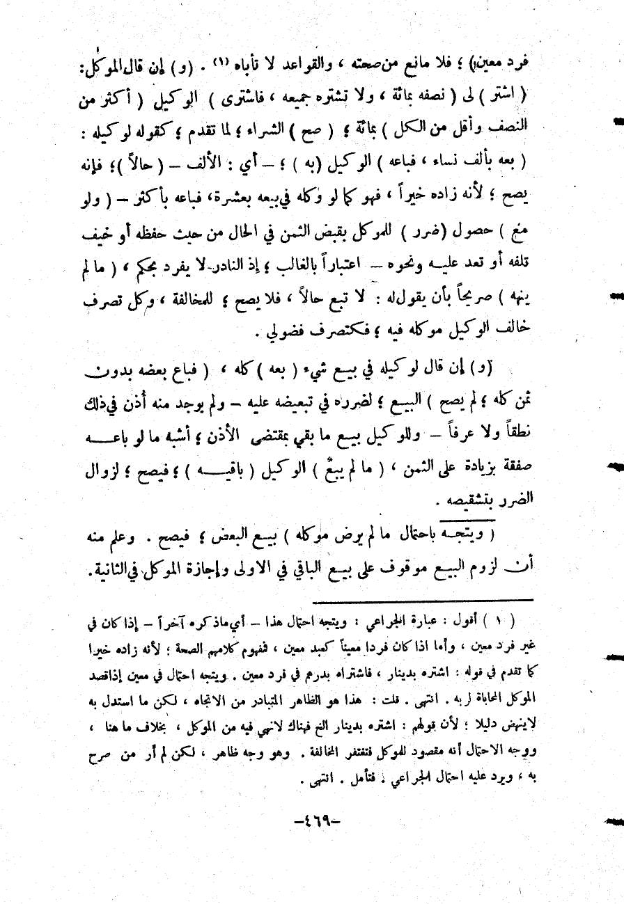 (وَ) إنْ قَالَ الْمُوَكِّلُ: (اشْتَرِ) لِي (نِصْفَهُ بِمِائَةٍ، وَلَا تَشْتَرِهِ جَمِيعَهُ، فَاشْتَرَى) الْوَكِيلُ (أَكْثَرَ مِنْ النِّصْفِ وَأَقَلَّ مِنْ الْكُلِّ) بِمِائَةٍ (صَحَّ) الشِّرَاءُ؛ لِمَا تَقَدَّمَ؛ كَقَوْلِهِ لِوَكِيلِهِ: (بِعْهُ بِأَلْفِ نَسَاءً، فَبَاعَهُ) الْوَكِيلُ (بِهِ) ؛ - أَيْ: الْأَلْفِ - (حَالًا) ؛ فَإِنَّهُ يَصِحُّ؛ لِأَنَّهُ زَادَهُ خَيْرًا، فَهُوَ كَمَا لَوْ وَكَّلَهُ فِي بَيْعِهِ بِعَشَرَةٍ، فَبَاعَهُ بِأَكْثَرَ - (وَلَوْ مَعَ) حُصُولِ (ضَرَرٍ) لِلْمُوَكِّلِ بِقَبْضِ الثَّمَنِ فِي الْحَالِ مِنْ حَيْثُ حِفْظُهُ أَوْ خِيفَ تَلَفُهُ أَوْ تَعَدٍّ عَلَيْهِ وَنَحْوُهُ - اعْتِبَارًا بِالْغَالِبِ؛ إذْ النَّادِرُ لَا يُفْرَدُ بِحُكْمٍ، (مَا لَمْ يَنْهَهُ) صَرِيحًا بِأَنْ يَقُولَ لَهُ: لَا تَبِعْ حَالًا، فَلَا يَصِحُّ؛ لِلْمُخَالَفَةِ، وَكُلُّ تَصَرُّفٍ خَالَفَ الْوَكِيلُ مُوَكِّلَهُ فِيهِ؛ فَكَتَصَرُّفِ فُضُولِيٍّ. .