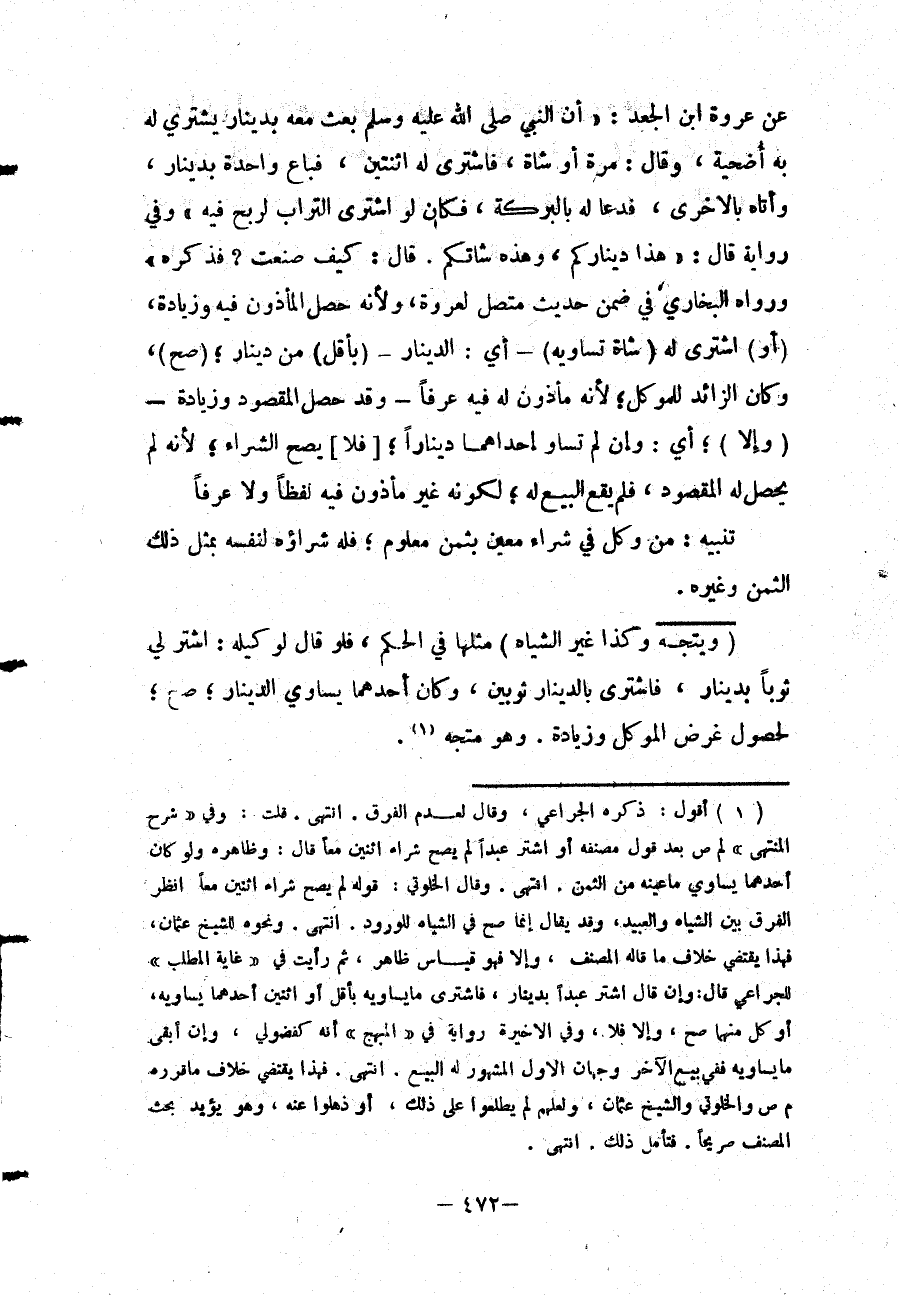 عَنْ عُرْوَةَ بْنِ الْجَعْدِ: «أَنَّ النَّبِيَّ - صَلَّى اللَّهُ عَلَيْهِ وَسَلَّمَ - بَعَثَ مَعَهُ بِدِينَارٍ يَشْتَرِي لَهُ بِهِ أُضْحِيَّةً، وَقَالَ: مَرَّةً أَوْ شَاةً، فَاشْتَرَى لَهُ اثْنَتَيْنِ، فَبَاعَ وَاحِدَةً بِدِينَارٍ، وَأَتَاهُ بِالْأُخْرَى، فَدَعَا لَهُ بِالْبَرَكَةِ، فَكَانَ لَوْ اشْتَرَى التُّرَابَ لَرَبِحَ فِيهِ وَفِي رِوَايَةٍ قَالَ: هَذَا دِينَارُكُمْ، وَهَذِهِ شَاتُكُمْ. قَالَ: كَيْفَ صَنَعْت؟ فَذَكَرَهُ» وَرَوَاهُ الْبُخَارِيُّ فِي ضِمْنِ حَدِيثٍ مُتَّصِلٍ لِعُرْوَةِ، وَلِأَنَّهُ حَصَلَ الْمَأْذُونُ فِيهِ وَزِيَادَةٌ، (أَوْ) اشْتَرَى لَهُ (شَاةً تُسَاوِيهِ) - أَيْ: الدِّينَارِ - (بِأَقَلَّ) مِنْ دِينَارٍ؛ (صَحَّ) ، وَكَانَ الزَّائِدُ لِلْمُوَكِّلِ؛ لِأَنَّهُ مَأْذُونٌ لَهُ فِيهِ عُرْفًا - وَقَدْ حَصَلَ الْمَقْصُودُ وَزِيَادَةٌ - (وَإِلَّا) ؛ أَيْ: وَإِنْ لَمْ تُسَاوِ إحْدَاهُمَا دِينَارًا؛ [فَلَا] يَصِحُّ الشِّرَاءُ؛ لِأَنَّهُ لَمْ يَحْصُلُ لَهُ الْمَقْصُودُ، فَلَمْ يَقَعْ الْبَيْعُ لَهُ؛ لِكَوْنِهِ غَيْرَ مَأْذُونٍ فِيهِ لَفْظًا وَلَا عُرْفًا
