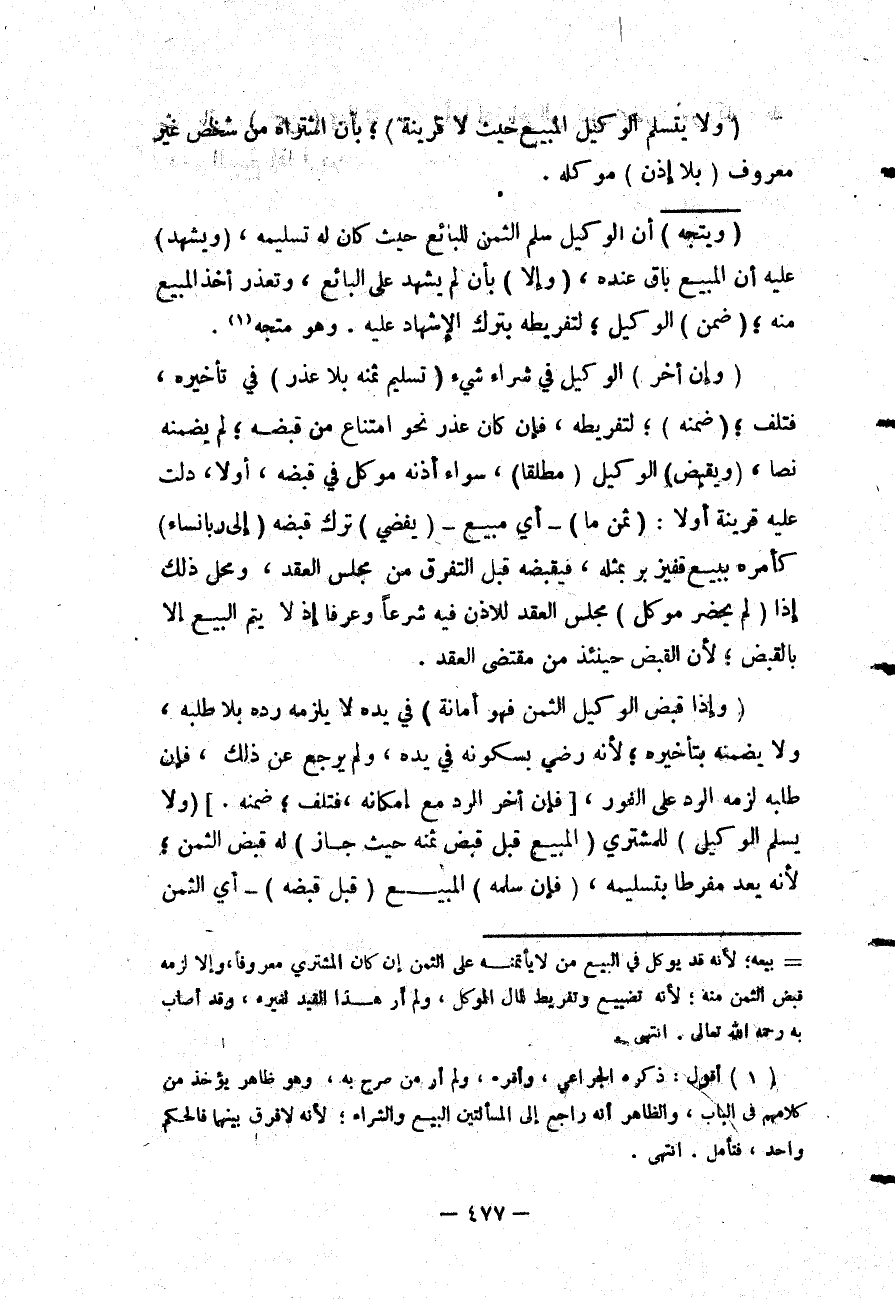 (وَيَتَّجِهُ) أَنَّ الْوَكِيلَ سَلَّمَ الثَّمَنَ لِلْبَائِعِ حَيْثُ كَانَ لَهُ تَسْلِيمُهُ، (وَيَشْهَدُ) عَلَيْهِ أَنَّ الْمَبِيعَ بَاقٍ عِنْدَهُ، (وإلَّا) بِأَنْ لَمْ يَشْهَدْ عَلَى الْبَائِعِ، وَتَعَذَّرَ أَخْذُ الْمَبِيعِ مِنْهُ؛ (ضَمِنَ) الْوَكِيلُ؛ لِتَفْرِيطِهِ بِتَرْكِ الْإِشْهَادِ عَلَيْهِ. وَهُوَ مُتَّجِهٌ.
