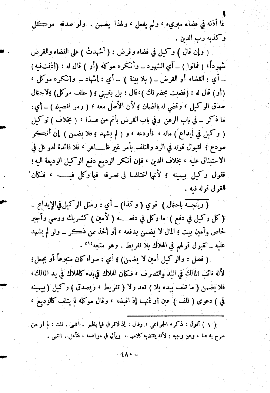 (وَيَتَّجِهُ بِاحْتِمَالٍ) قَوِيٍّ (وَكَذَا) - أَيْ: وَمِثْلُ الْوَكِيلِ فِي الْإِيدَاعِ - (كُلُّ وَكِيلٍ فِي دَفْعِ) مَا وُكِّلَ فِي دَفْعِهِ (لِأَمِينٍ) كَشَرِيكٍ وَوَصِيٍّ وَأَجِيرٍ خَاصٍّ وَأَمِينِ بَيْتِ الْمَالِ لَا يَضْمَنُ بِدَفْعِهِ، أَوْ أَخْذٍ مِمَّنْ ذُكِرَ وَلَوْ لَمْ يُشْهِدْ عَلَيْهِ - لِقَبُولِ قَوْلِهِمْ فِي الْهَلَاكِ بِلَا تَفْرِيطٍ. وَهُوَ مُتَّجِهٌ