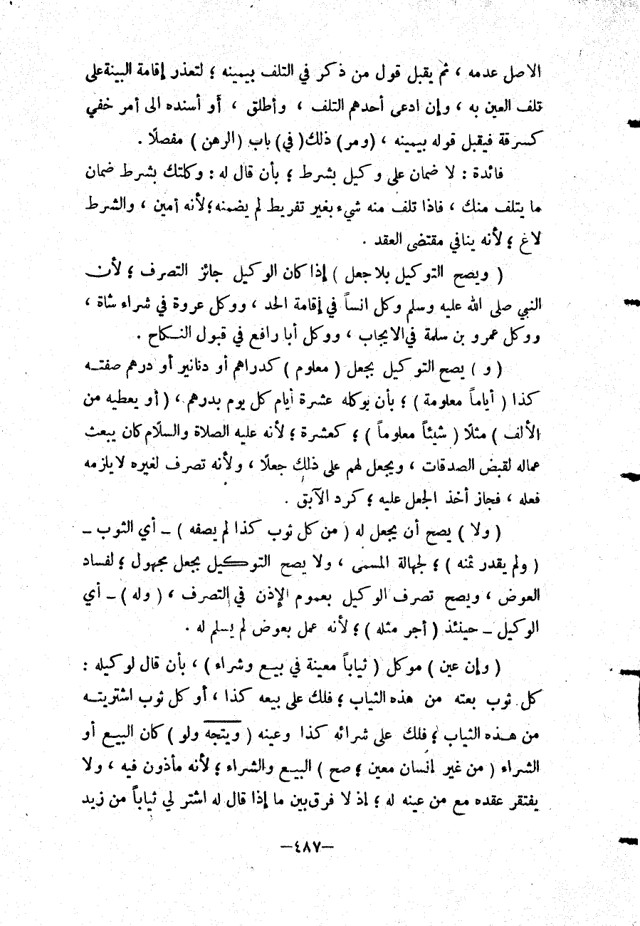 ٍ؛ بِأَنْ قَالَ لَهُ: وَكَّلْتُك بِشَرْطِ ضَمَانِ مَا يَتْلَفُ مِنْك فَإِذَا تَلِفَ مِنْهُ شَيْءٌ بِغَيْرِ تَفْرِيطٍ لَمْ يَضْمَنْهُ؛ لِأَنَّهُ أَمِينٌ، وَالشَّرْطُ لَاغٍ؛ لِأَنَّهُ يُنَافِي مُقْتَضَى الْعَقْدِ