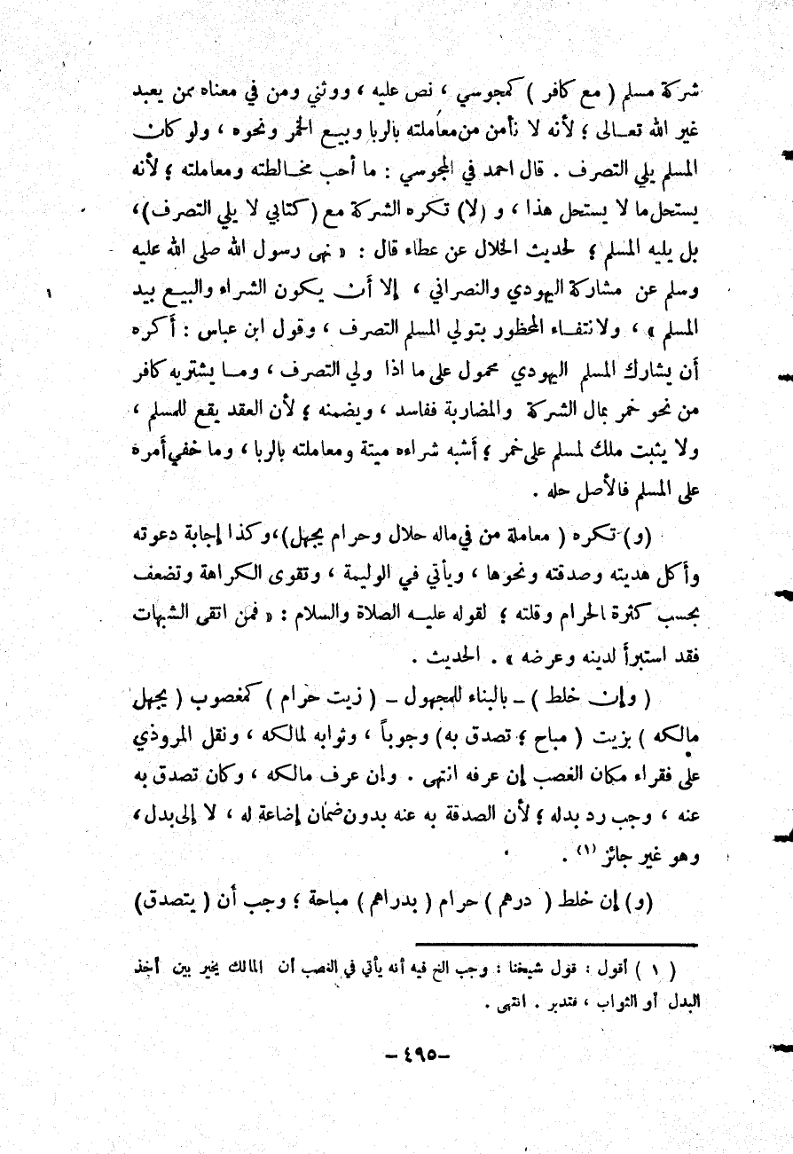 شَرِكَةُ مُسْلِمٍ (مَعَ كَافِرٍ) كَمَجُوسِيٍّ، نُصَّ عَلَيْهِ، وَوَثَنِيٍّ وَمَنْ فِي مَعْنَاهُ مِمَّنْ يَعْبُدُ غَيْرَ اللَّهِ تَعَالَى؛ لِأَنَّهُ لَا نَأْمَنُ مِنْ مُعَامَلَتِهِ بِالرِّبَا وَبَيْعِ الْخَمْرِ وَنَحْوِهِ، وَلَوْ كَانَ الْمُسْلِمُ يَلِي التَّصَرُّفَ. قَالَ أَحْمَدُ فِي الْمَجُوسِيِّ: مَا أُحِبُّ مُخَالَطَتَهُ وَمُعَامَلَتَهُ؛ لِأَنَّهُ يَسْتَحِلُّ مَا لَا يَسْتَحِلُّ هَذَا و (لَا) تُكْرَهُ الشَّرِكَةُ مَعَ (كِتَابِيٍّ لَا يَلِي التَّصَرُّفَ) ، بَلْ يَلِيهِ الْمُسْلِمُ؛ لِحَدِيثِ الْخَلَّالِ عَنْ عَطَاءٍ قَالَ: «نَهَى رَسُولُ اللَّهِ - صَلَّى اللَّهُ عَلَيْهِ وَسَلَّمَ - عَنْ مُشَارَكَةِ الْيَهُودِيِّ وَالنَّصْرَانِيِّ، إلَّا أَنْ يَكُونَ الشِّرَاءُ وَالْبَيْعُ بِيَدِ الْمُسْلِمِ» ، وَلِانْتِفَاءِ الْمَحْظُورِ بِتَوَلِّي الْمُسْلِمِ التَّصَرُّفَ، وَقَوْلُ ابْنِ عَبَّاسٍ: أَكْرَهُ أَنْ يُشَارِكَ الْمُسْلِمُ الْيَهُودِيَّ مَحْمُولٌ عَلَى مَا إذَا وَلِيَ التَّصَرُّفَ.