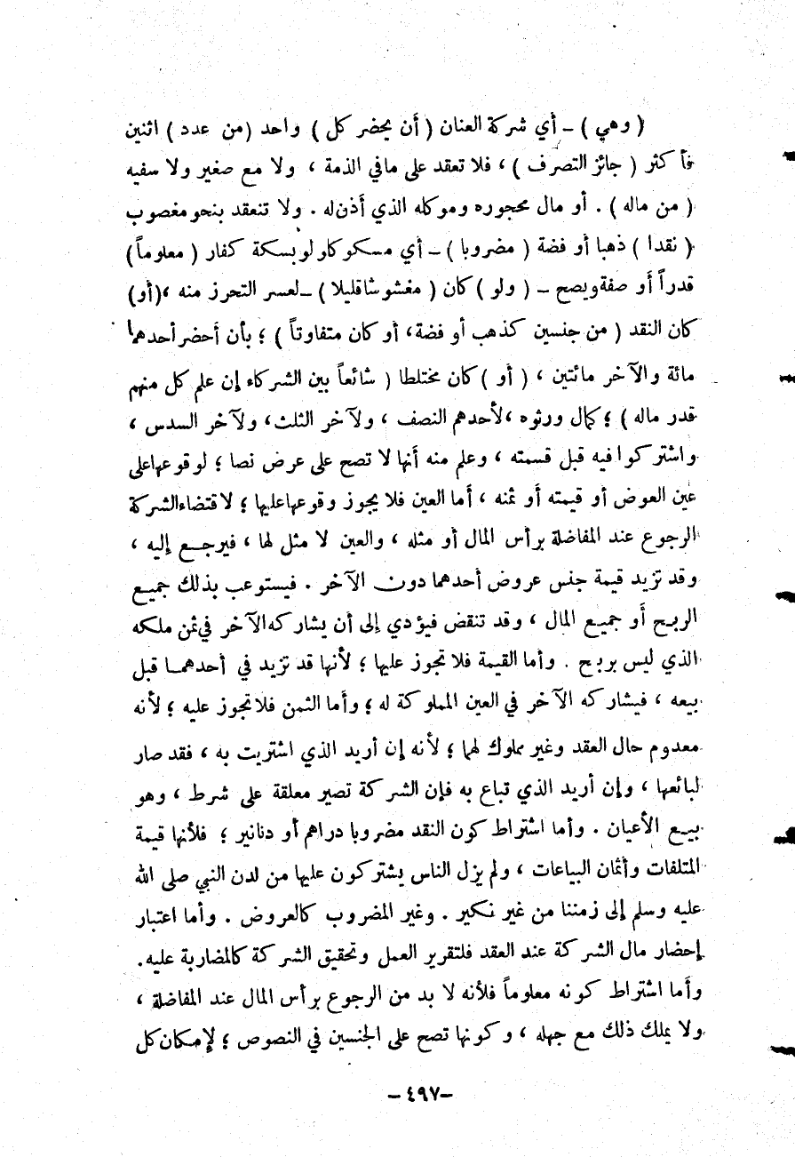 وَأَمَّا اشْتِرَاطُ كَوْنِ النَّقْدِ مَضْرُوبًا دَرَاهِمَ أَوْ دَنَانِيرَ؛ فَلِأَنَّهَا قِيمَةُ الْمُتْلَفَاتِ وَأَثْمَانُ الْبِيَاعَاتِ، وَلَمْ يَزَلْ النَّاسُ يَشْتَرِكُونَ عَلَيْهَا مِنْ لَدُنْ النَّبِيِّ - صَلَّى اللَّهُ عَلَيْهِ وَسَلَّمَ - إلَى زَمَنِنَا مِنْ غَيْرِ نَكِيرٍ. وَغَيْرُ الْمَضْرُوبِ كَالْعُرُوضِ. وَأَمَّا اعْتِبَارُ إحْضَارِ مَالِ الشَّرِكَةِ عِنْدَ الْعَقْدِ فَلِتَقْرِيرِ الْعَمَلِ وَتَحْقِيقِ الشَّرِكَةِ كَالْمُضَارَبَةِ عَلَيْهِ. وَأَمَّا اشْتِرَاطُ كَوْنِهِ مَعْلُومًا فَلِأَنَّهُ لَا بُدَّ مِنْ الرُّجُوعِ بِرَأْسِ الْمَالِ عِنْدَ الْمُفَاضَلَةِ، وَلَا يَمْلِكُ ذَلِكَ مَعَ جَهْلِهِ، وَكَوْنُهَا تَصِحُّ عَلَى الْجِنْسَيْنِ فِي النُّصُوصِ؛ لِإِمْكَانِ كُلِّ