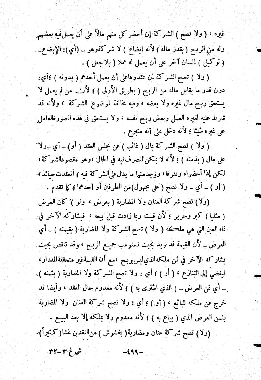 (وَلَا) تَصِحُّ الشَّرِكَةُ إنْ عَقَدُوهَا عَلَى أَنْ يَعْمَلَ أَحَدُهُمْ (بِدُونِهِ) ؛ أَيْ: دُونَ قَدْرِ مَا يُقَابِلُ مَالَهُ مِنْ الرِّبْحِ (بِطَرِيقِ الْأَوْلَى) ؛ لِأَنَّ مَنْ لَمْ يَعْمَلْ لَا يَسْتَحِقُّ رِبْحَ مَالِ غَيْرِهِ وَلَا بَعْضَهُ، وَفِيهِ مُخَالَفَةٌ لِمَوْضُوعِ الشَّرِكَةِ، وَلِأَنَّهُ قَدْ شُرِطَ عَلَيْهِ لِغَيْرِهِ الْعَمَلُ وَبَعْضُ رِبْحِ نَفْسِهِ، وَلَا يَسْتَحِقُّ فِي هَذِهِ الصُّورَةِ الْعَامِلُ عَلَى غَيْرِهِ شَيْئًا؛ لِأَنَّهُ دَخَلَ عَلَى أَنَّهُ مُتَبَرِّعٌ
