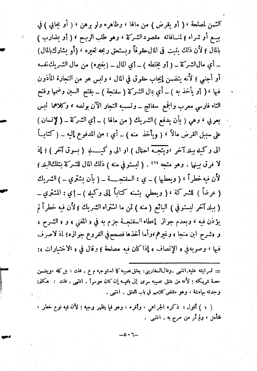 الثَّمَنِ لِمَصْلَحَةٍ، (أَوْ يُقْرِضَ) مِنْ مَالِهَا، وَظَاهِرُهُ وَلَوْ بِرَهْنٍ، (أَوْ يُحَابِيَ) فِي بَيْعٍ أَوْ شِرَاءٍ؛ لِمُنَافَاتِهِ مَقْصُودَ الشَّرِكَةِ، وَهُوَ طَلَبُ الرِّبْحِ، (أَوْ يُضَارِبَ) بِالْمَالِ؛ لِأَنَّ ذَلِكَ يُثْبِتُ فِي الْمَالِ حُقُوقًا وَيَسْتَحِقُّ رِبْحُهُ لِغَيْرِهِ، (أَوْ يُشَارِكَ بِالْمَالِ) - أَيْ مَالِ الشَّرِكَةِ - (أَوْ يَخْلِطَهُ) - أَيْ الْمَالَ - (بِغَيْرِهِ) مِنْ مَالِ الشَّرِيكِ نَفْسِهِ أَوْ أَجْنَبِيٍّ؛ لِأَنَّهُ يَتَضَمَّنُ إيجَابَ حُقُوقٍ فِي الْمَالِ، وَلَيْسَ هُوَ مِنْ التِّجَارَةِ الْمَأْذُونِ فِيهَا، (أَوْ يَأْخُذَ بِهِ) - أَيْ بِمَالِ الشَّرِكَةِ (سَفْتَجَةً) - بِفَتْحِ السِّينِ وَضَمِّهَا وَفَتْحِ التَّاءِ فَارِسِيٌّ مُعَرَّبٌ وَالْجَمْعُ سَفَاتِجُ - وَتُسَمِّيهِ التُّجَّارُ الْآنَ بولصة، وَكِلَاهُمَا لَيْسَ بِعَرَبِيٍّ، وَهِيَ (بِأَنْ يَدْفَعَ) الشَّرِيكُ (مِنْ مَالِهَا) - أَيْ الشَّرِكَةِ - (لِإِنْسَانٍ) عَلَى سَبِيلِ الْقَرْضِ مَالًا، (وَيَأْخُذَ مِنْهُ) - أَيْ: مِنْ الْمَدْفُوعِ إلَيْهِ (كِتَابًا إلَى وَكِيلِهِ بِبَلَدٍ آخَرَ، وَيَتَّجِهُ احْتِمَالٌ) أَوْ إلَى وَكِيلِهِ (بِسُوقٍ آخَرَ) ؛ إذْ لَا فَرْقَ بَيْنَهُمَا. وَهُوَ مُتَّجِهٌ. (لِيَسْتَوْفِيَ مِنْهُ) ذَلِكَ الْمَالَ لِلشَّرِكَةِ بِتِلْكَ الْبَلَدِ؛ لِأَنَّ فِيهِ خَطَرًا، (وَيُعْطِيَهَا) - أَيْ: السَّفْتَجَةَ - (بِأَنْ يَشْتَرِيَ -) الشَّرِيكُ (عَرْضًا) لِلشَّرِكَةِ، (وَيُعْطِيَ بِثَمَنِهِ كِتَابًا إلَى وَكِيلِهِ) - أَيْ: الْمُشْتَرِي - (بِبَلَدٍ آخَرَ لِيَسْتَوْفِيَ) الْبَائِعُ (مِنْهُ) ثَمَنَ مَا اشْتَرَاهُ الشَّرِيكُ لِأَنَّ فِيهِ خَطَرًا لَمْ يُؤْذَنْ فِيهِ، وَبِعَدَمِ جَوَازِ إعْطَاءِ السَّفْتَجَةِ جَزَمَ بِهِ فِي " الْمُغْنِي وَالشَّرْحِ " " وَشَرْحُ ابْنِ مُنَجَّى " وَغَيْرِهِمْ، وَأَمَّا أَخْذُهَا فَصَحَّحَ فِي الْفُرُوعِ جَوَازَهُ؛ إذْ لَا صَرْفَ فِيهَا، وَصَوَّبَهُ فِي " الْإِنْصَافِ " إذَا كَانَ فِيهِ مَصْلَحَةٌ.