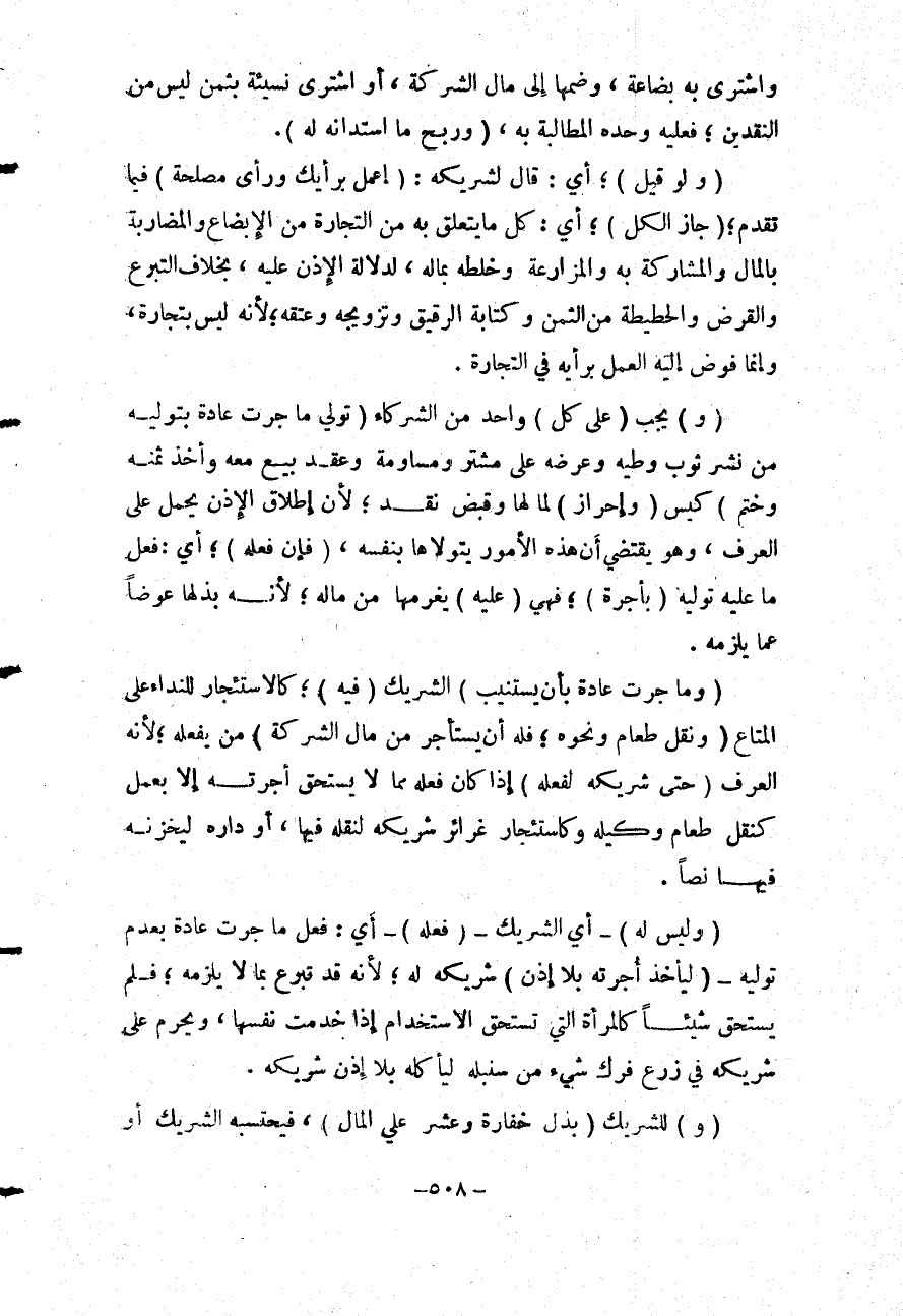 (وَ) يَجِبُ (عَلَى كُلِّ) وَاحِدٍ مِنْ الشُّرَكَاءِ (تَوَلِّي مَا جَرَتْ عَادَةٌ بِتَوَلِّيهِ مِنْ نَشْرِ ثَوْبٍ وَطَيِّهِ وَعَرْضِهِ عَلَى مُشْتَرٍ وَمُسَاوَمَةٍ وَعَقْدِ بَيْعٍ مَعَهُ وَأَخْذِ ثَمَنِهِ وَخَتْمِ) كِيسٍ (وَإِحْرَازٍ) لِمَا لَهَا وَقَبْضِ نَقْدٍ؛ لِأَنَّ إطْلَاقَ الْإِذْنِ يُحْمَلُ عَلَى الْعُرْفِ، وَهُوَ يَقْتَضِي أَنَّ هَذِهِ الْأُمُورَ يَتَوَلَّاهَا بِنَفْسِهِ، (فَإِنْ فَعَلَهُ) ؛ أَيْ: فَعَلَ مَا عَلَيْهِ تَوَلِّيهِ (بِأُجْرَةٍ) ؛ فَهِيَ (عَلَيْهِ) يَغْرَمُهَا مِنْ مَالِهِ؛ لِأَنَّهُ بَذَلَهَا عِوَضًا عَمَّا يَلْزَمُهُ.