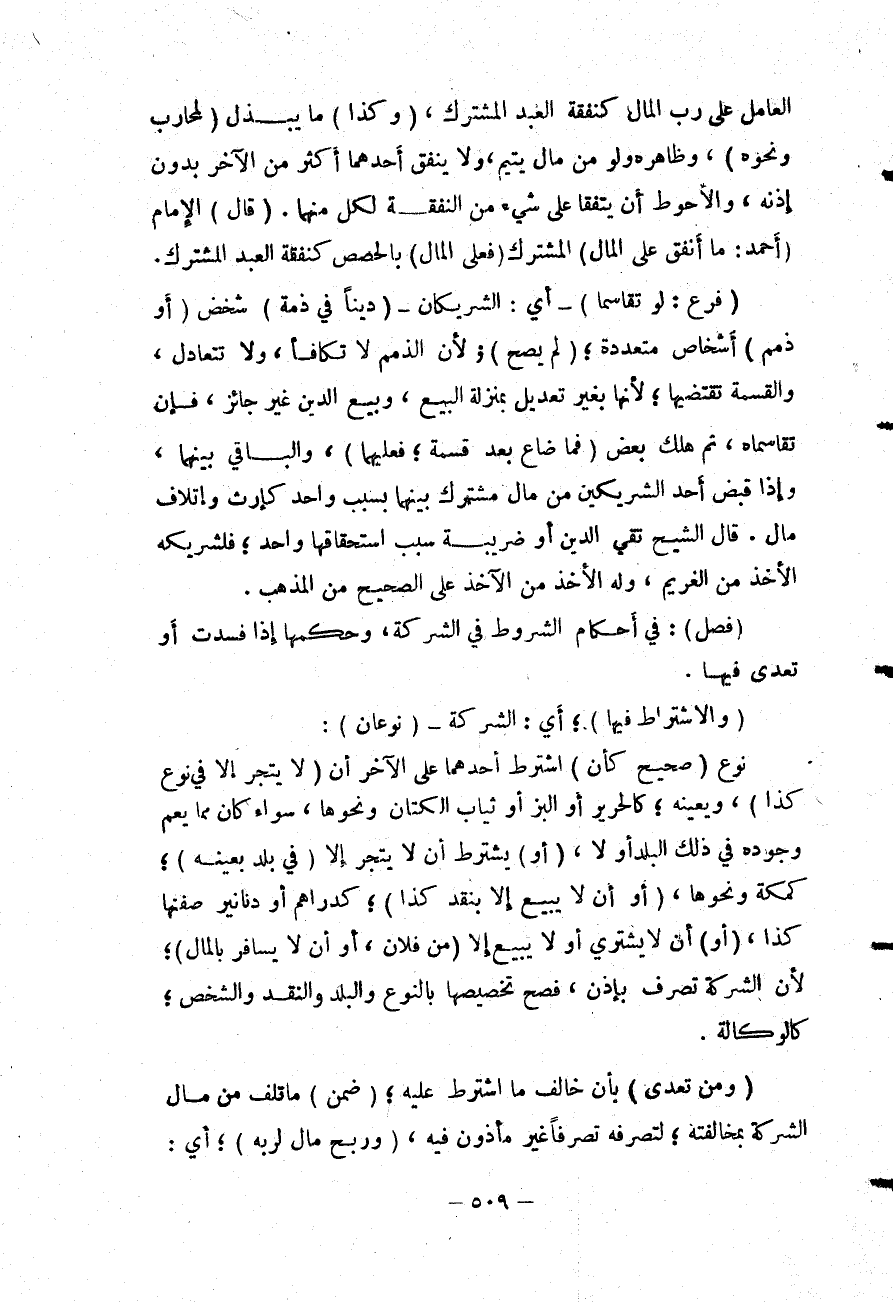 (وَالِاشْتِرَاطُ فِيهَا) ؛ أَيْ: الشَّرِكَةِ (نَوْعَانِ) : نَوْعٌ (صَحِيحٌ كَأَنْ) اشْتَرَطَ أَحَدُهُمَا عَلَى الْآخَرِ أَنْ (لَا يَتَّجِرَ إلَّا فِي نَوْعِ كَذَا) ، وَيُعَيِّنُهُ؛ كَالْحَرِيرِ أَوْ الْبَزِّ أَوْ ثِيَابِ الْكَتَّانِ وَنَحْوِهَا، سَوَاءٌ كَانَ مِمَّا يَعُمُّ وُجُودُهُ فِي ذَلِكَ الْبَلَدِ أَوْ لَا، (أَوْ) يَشْتَرِطَ أَنْ لَا يَتَّجِرَ إلَّا (فِي بَلَدٍ بِعَيْنِهِ) ؛ كَمَكَّةَ وَنَحْوِهَا، (أَوْ أَنْ لَا يَبِيعَ إلَّا بِنَقْدِ كَذَا) ؛ كَدَرَاهِمَ أَوْ دَنَانِيرَ صِفَتُهَا كَذَا، (أَوْ) أَنْ لَا يَشْتَرِيَ أَوْ لَا يَبِيعَ إلَّا (مِنْ فُلَانٍ، أَوْ أَنْ لَا يُسَافِرَ بِالْمَالِ) ؛ لِأَنَّ الشَّرِكَةَ تَصَرُّفٌ؛ بِإِذْنٍ، فَصَحَّ تَخْصِيصُهَا بِالنَّوْعِ وَالْبَلَدِ وَالنَّقْدِ وَالشَّخْصِ؛ كَالْوَكَالَةِ.