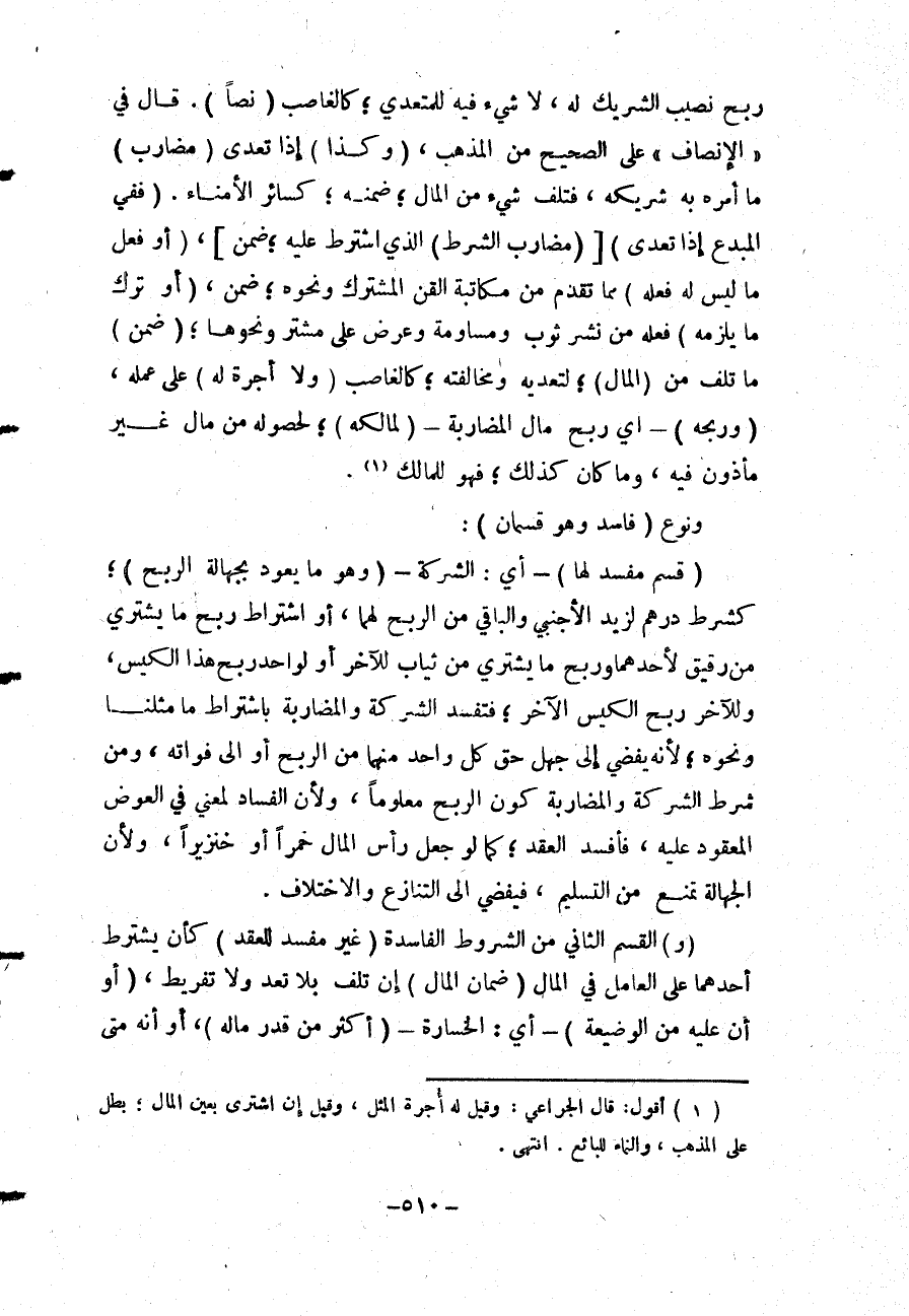 وَنَوْعٌ (فَاسِدٌ وَهُوَ قِسْمَانِ) : (قِسْمٌ مُفْسِدٌ لَهَا) - أَيْ: الشَّرِكَةِ - (وَهُوَ مَا يَعُودُ بِجَهَالَةِ الرِّبْحِ) ؛ كَشَرْطِ دِرْهَمٍ لِزَيْدٍ الْأَجْنَبِيِّ وَالْبَاقِي مِنْ الرِّبْحِ لَهُمَا، أَوْ اشْتِرَاطِ رِبْحِ مَا يَشْتَرِي مِنْ رَقِيقٍ لِأَحَدِهِمَا وَرِبْحِ مَا يَشْتَرِي مِنْ ثِيَابٍ لِلْآخَرِ، أَوْ لِوَاحِدٍ رِبْحُ هَذَا الْكِيسِ وَلِلْآخَرِ رِبْحُ الْكِيسِ الْآخَرِ؛ فَتَفْسُدُ الشَّرِكَةُ وَالْمُضَارَبَةُ بِاشْتِرَاطِ مَا مَثَّلْنَا وَنَحْوِهِ؛ لِأَنَّهُ يُفْضِي إلَى جَهْلِ حَقِّ كُلِّ وَاحِدٍ مِنْهُمَا مِنْ الرِّبْحِ أَوْ إلَى فَوَاتِهِ، وَمِنْ شَرْطِ الشَّرِكَةِ وَالْمُضَارَبَةِ كَوْنُ الرِّبْحِ مَعْلُومًا، وَلِأَنَّ الْفَسَادَ لِمَعْنًى فِي الْعِوَضِ الْمَعْقُودِ عَلَيْهِ، فَأَفْسَدَ الْعَقْدَ؛ كَمَا لَوْ جَعَلَ رَأْسَ الْمَالِ خَمْرًا أَوْ خِنْزِيرًا، وَلِأَنَّ الْجَهَالَةَ تَمْنَعُ مِنْ التَّسْلِيمِ، فَيُفْضِي إلَى التَّنَازُعِ وَالِاخْتِلَافِ.