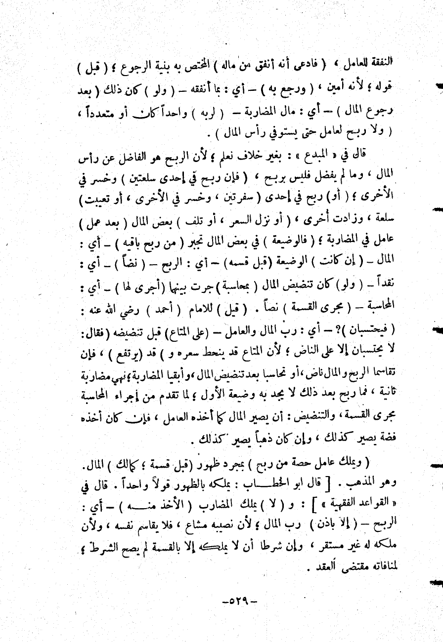 (وَلَا رِبْحَ لِعَامِلٍ حَتَّى يَسْتَوْفِيَ رَأْسَ الْمَالِ) . قَالَ فِي " الْمُبْدِعِ ": بِغَيْرِ خِلَافٍ نَعْلَمُ؛ لِأَنَّ الرِّبْحَ هُوَ الْفَاضِلُ عَنْ رَأْسِ الْمَالِ، وَمَا لَمْ يَفْضُلْ فَلَيْسَ بِرِبْحٍ، (فَإِنْ رَبِحَ فِي إحْدَى سِلْعَتَيْنِ) وَخَسِرَ فِي الْأُخْرَى؛ (أَوْ) رَبِحَ فِي إحْدَى (سَفْرَتَيْنِ، وَخَسِرَ فِي الْأُخْرَى، أَوْ تَعَيَّبَتْ) سِلْعَةٌ، وَزَادَتْ أُخْرَى، (أَوْ نَزَلَ السِّعْرُ، أَوْ تَلِفَ) بَعْضُ الْمَالِ (بَعْدَ عَمَلِ) عَامِلٍ فِي الْمُضَارَبَةِ؛ (فَالْوَضِيعَةُ) فِي بَعْضِ الْمَالِ تُجْبَرُ (مِنْ رِبْحِ بَاقِيهِ) - أَيْ: الْمَالِ - (إنْ كَانَتْ) الْوَضِيعَةُ (قَبْلَ قَسْمِهِ) - أَيْ: الرِّبْحِ - (نَضًّا) - أَيْ: نَقْدًا - (وَلَوْ) كَانَ تنضيض الْمَالِ (بِمُحَاسَبَةٍ) جَرَتْ بَيْنَهُمَا (أُجْرِيَ لَهَا) - أَيْ: الْمُحَاسَبَةِ - (مُجْرَى الْقِسْمَةِ) نَصًّا.
