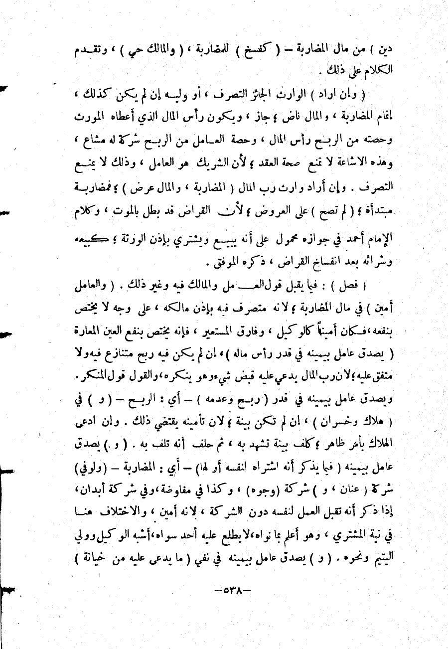 دَيْنٍ) مِنْ مَالِ الْمُضَارَبَةِ - (كَفَسْخٍ) لِلْمُضَارَبَةِ، (وَالْمَالِكُ حَيٌّ) ، وَتَقَدَّمَ الْكَلَامُ عَلَى ذَلِكَ.