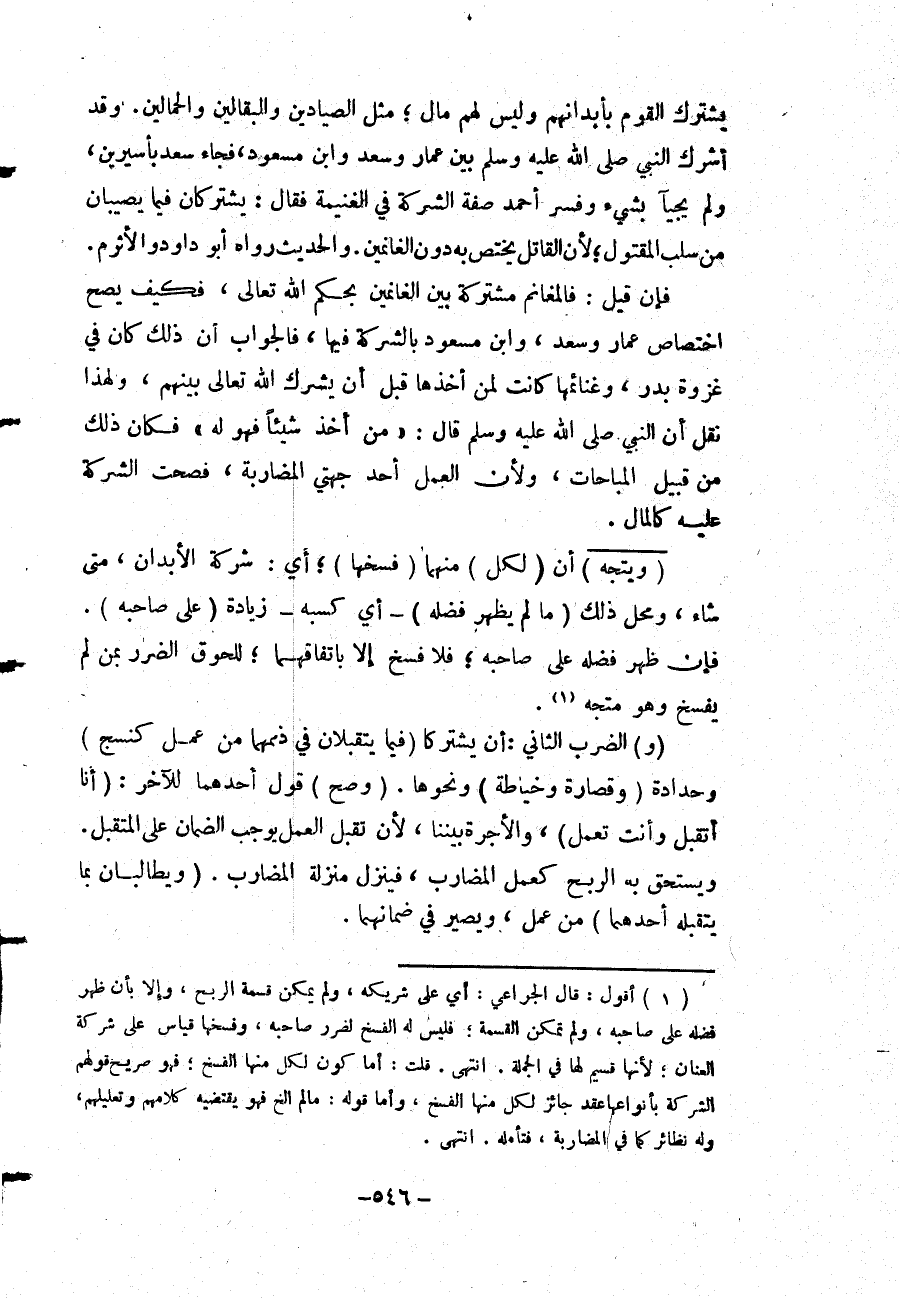 «وَقَدْ أَشْرَكَ النَّبِيُّ - صَلَّى اللَّهُ عَلَيْهِ وَسَلَّمَ - بَيْنَ عَمَّارٍ وَسَعْدٍ وَابْنِ مَسْعُودٍ، فَجَاءَ سَعْدٌ بِأَسِيرَيْنِ، وَلَمْ يَجِيئَا بِشَيْءٍ» وَفَسَّرَ أَحْمَدُ صِفَةَ الشَّرِكَةِ فِي الْغَنِيمَةِ فَقَالَ: يَشْتَرِكَانِ فِيمَا يُصِيبَانِ مِنْ سَلَبِ الْمَقْتُولِ؛ لِأَنَّ الْقَاتِلَ يَخْتَصُّ بِهِ دُونَ الْغَانِمِينَ. وَالْحَدِيثُ رَوَاهُ أَبُو دَاوُد وَالْأَثْرَمُ. فَإِنْ قِيلَ: فَالْمَغَانِمُ مُشْتَرَكَةٌ بَيْنَ الْغَانِمِينَ بِحُكْمِ اللَّهِ تَعَالَى، فَكَيْف يَصِحُّ اخْتِصَاصُ عَمَّارٍ وَسَعْدٍ وَابْنِ مَسْعُودٍ بِالشَّرِكَةِ فِيهَا، فَالْجَوَابُ أَنَّ ذَلِكَ كَانَ فِي غَزْوَةِ بَدْرٍ، وَغَنَائِمُهَا كَانَتْ لِمَنْ أَخَذَهَا قَبْلَ أَنْ يُشْرِكَ اللَّهُ تَعَالَى بَيْنَهُمْ، وَلِهَذَا نُقِلَ أَنَّ النَّبِيَّ - صَلَّى اللَّهُ عَلَيْهِ وَسَلَّمَ - قَالَ: «مَنْ أَخَذَ شَيْئًا فَهُوَ لَهُ» فَكَانَ ذَلِكَ مِنْ قَبِيلِ الْمُبَاحَاتِ، وَلِأَنَّ الْعَمَلَ أَحَدُ جِهَتَيْ الْمُضَارَبَةِ، فَصَحَّتْ الشَّرِكَةُ عَلَيْهِ كَالْمَالِ.