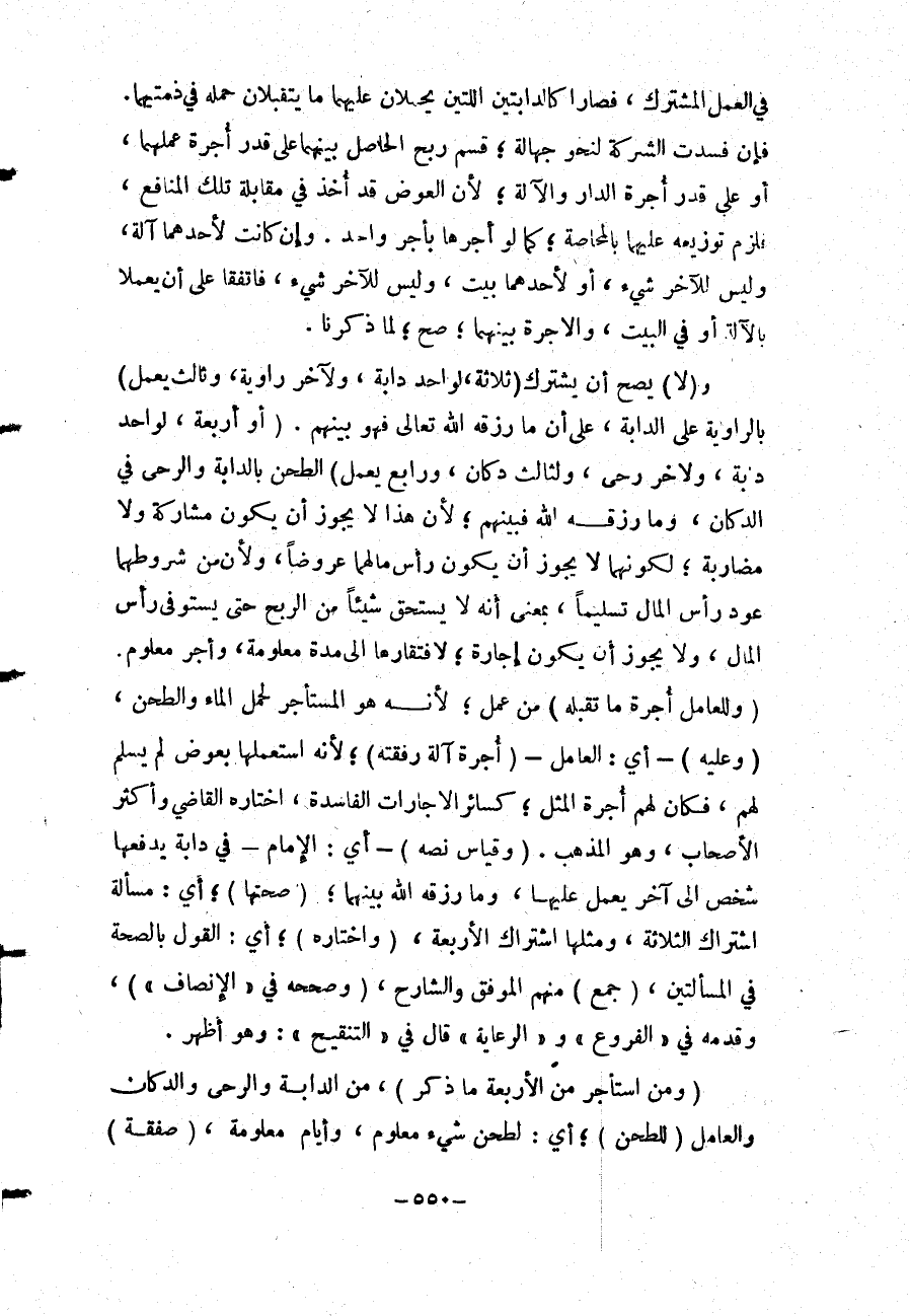 و (لَا) يَصِحُّ أَنْ يَشْتَرِكَ (ثَلَاثَةٌ، لِوَاحِدٍ دَابَّةٌ، وَلِآخَرَ رَاوِيَةٌ، وَثَالِثٌ يَعْمَلُ) بِالرَّاوِيَةِ عَلَى الدَّابَّةِ، عَلَى أَنْ مَا رَزَقَهُ اللَّهُ تَعَالَى فَهُوَ بَيْنَهُمْ. (أَوْ أَرْبَعَةٌ، لِوَاحِدٍ دَابَّةٌ، وَلِآخَرَ رَحًى، وَلِثَالِثٍ دُكَّانٌ، وَرَابِعٌ يَعْمَلُ) الطَّحْنَ بِالدَّابَّةِ وَالرَّحَى فِي الدُّكَّانِ، وَمَا رَزَقَهُ اللَّهُ فَبَيْنَهُمْ؛ لِأَنَّ هَذَا لَا يَجُوزُ أَنْ يَكُونَ مُشَارَكَةً وَلَا مُضَارَبَةً؛ لِكَوْنِهِمَا لَا يَجُوزُ أَنْ يَكُونَ رَأْسُ مَالِهِمَا عُرُوضًا، وَلِأَنَّ مِنْ شُرُوطِهِمَا عَوْدَ رَأْسِ الْمَالِ تَسْلِيمًا، بِمَعْنَى أَنَّهُ لَا يَسْتَحِقُّ شَيْئًا مِنْ الرِّبْحِ حَتَّى يُسْتَوْفَى رَأْسُ الْمَالِ، وَلَا يَجُوزُ أَنْ يَكُونَ إجَارَةً؛ لِافْتِقَارِهَا إلَى مُدَّةٍ مَعْلُومَةٍ، وَأَجْرٍ مَعْلُومٍ. (وَلِلْعَامِلِ أُجْرَةُ مَا تَقَبَّلَهُ) مِنْ عَمَلٍ؛ لِأَنَّهُ هُوَ الْمُسْتَأْجَرُ لِحَمْلِ الْمَاءِ وَالطَّحْنِ، (وَعَلَيْهِ) - أَيْ: الْعَامِلِ - (أُجْرَةُ آلَةِ رُفْقَتِهِ) ؛ لِأَنَّهُ اسْتَعْمَلَهَا بِعِوَضٍ لَمْ يُسَلَّمْ لَهُمْ، فَكَانَ لَهُمْ أُجْرَةُ الْمِثْلِ؛ كَسَائِرِ الْإِجَارَاتِ الْفَاسِدَةِ، اخْتَارَهُ الْقَاضِي وَأَكْثَرُ الْأَصْحَابِ، وَهُوَ الْمَذْهَبُ. (وَقِيَاسُ نَصِّهِ) - أَيْ: الْإِمَامِ - فِي دَابَّةٍ يَدْفَعُهَا شَخْصٌ إلَى آخَرَ يَعْمَلُ عَلَيْهَا، وَمَا رَزَقَهُ اللَّهُ بَيْنَهُمَا؛ (صِحَّتُهَا) ؛ أَيْ: مَسْأَلَةِ اشْتَرَاكِ الثَّلَاثَةِ، وَمِثْلُهَا اشْتِرَاكُ الْأَرْبَعَةِ، (وَاخْتَارَهُ) ؛ أَيْ: الْقَوْلَ بِالصِّحَّةِ فِي الْمَسْأَلَتَيْنِ، (جَمْعٌ) مِنْهُمْ الْمُوَفَّقُ وَالشَّارِحُ، (وَصَحَّحَهُ فِي " الْإِنْصَافِ ") ، وَقَدَّمَهُ فِي " الْفُرُوعِ " وَالرِّعَايَةِ " قَالَ فِي " التَّنْقِيحِ ": وَهُوَ أَظْهَرُ.