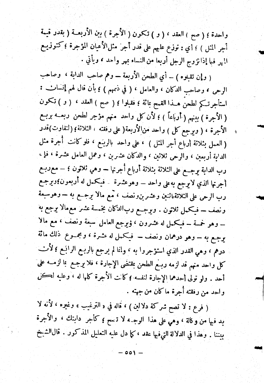 (وَإِنَّ تَقَبَّلُوهُ) - أَيْ الطَّحْنَ الْأَرْبَعَةُ - وَهُمْ صَاحِبُ الدَّابَّةِ، وَصَاحِبُ الرَّحَى، وَصَاحِبُ الدُّكَّانِ، وَالْعَامِلُ، (فِي ذِمَمِهِمْ) ؛ بِأَنْ قَالَ لَهُمْ إنْسَانٌ: اسْتَأْجَرْتُكُمْ لِطَحْنِ هَذَا الْقَمْحِ بِمِائَةٍ؛ فَقَبِلُوا؛ (صَحَّ) الْعَقْدُ، (وَ) تَكُونُ (الْأُجْرَةُ) بَيْنَهُمْ (أَرْبَاعًا) ؛ لِأَنَّ كُلَّ وَاحِدٍ مِنْهُمْ مُؤَجَّرٌ لِطَحْنِ رُبْعِهِ بِرُبْعِ الْأُجْرَةِ، (وَيَرْجِعُ كُلُّ) وَاحِدٍ مِنْ الْأَرْبَعَةِ (عَلَى رُفْقَتِهِ) الثَّلَاثَةِ؛ (لِتَفَاوُتِ) قَدْرِ (الْعَمَلِ بِثَلَاثَةِ أَرْبَاعِ أَجْرِ الْمِثْلِ) ، عَلَى وَاحِدٍ بِالرُّبْعِ، فَلَوْ كَانَتْ أُجْرَةُ مِثْلِ الدَّابَّةِ أَرْبَعِينَ، وَالرَّحَى ثَلَاثِينَ، وَالدُّكَّانِ عِشْرِينَ، وَعَمَلِ الْعَامِلِ عَشَرَةً، فَإِنَّ رَبَّ الدَّابَّةِ يَرْجِعُ عَلَى الثَّلَاثَةِ بِثَلَاثَةِ أَرْبَاعِ أُجْرَتِهَا - وَهِيَ ثَلَاثُونَ؛ - مَعَ رُبْعِ أُجْرَتِهَا الَّذِي لَا يَرْجِعُ بِهِ عَلَى وَاحِدٍ - وَهُوَ عَشَرَةٌ - فَيَكْمُلُ لَهُ أَرْبَعُونَ؛ وَيَرْجِعُ رَبُّ الرَّحَى عَلَى الثَّلَاثَةِ بِاثْنَيْنِ وَعِشْرِينَ وَنِصْفٍ، مَعَ مَا لَا يَرْجِعُ بِهِ - وَهُوَ سَبْعَةٌ وَنِصْفٌ - فَيَكْمُلُ ثَلَاثُونَ.