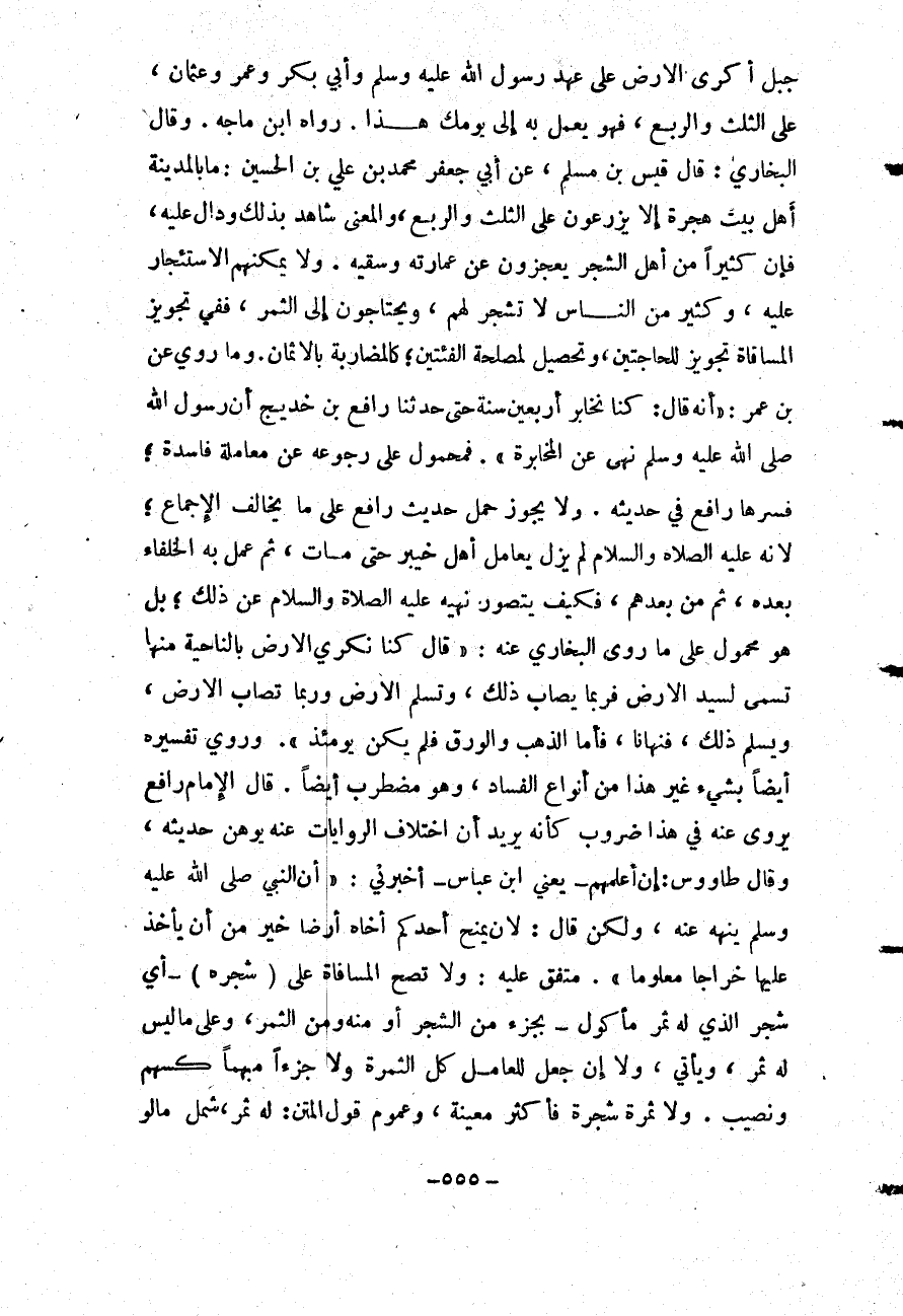أَكْرَى الْأَرْضَ عَلَى عَهْدِ رَسُولِ اللَّهِ - صَلَّى اللَّهُ عَلَيْهِ وَسَلَّمَ - وَأَبِي بَكْرٍ وَعُمَرَ وَعُثْمَانَ، عَلَى الثُّلُثِ وَالرُّبْعِ، فَهُوَ يُعْمَلُ بِهِ إلَى يَوْمِكَ هَذَا. رَوَاهُ ابْنُ مَاجَهْ. وَقَالَ الْبُخَارِيُّ: قَالَ قَيْسُ بْنُ مُسْلِمٍ، عَنْ أَبِي جَعْفَرٍ مُحَمَّدِ بْنِ عَلِيِّ بْنِ الْحُسَيْنِ: مَا بِالْمَدِينَةِ أَهْلُ بَيْتِ هِجْرَةٍ إلَّا يَزْرَعُونَ عَلَى الثُّلُثِ وَالرُّبْعِ، وَالْمَعْنَى شَاهِدٌ بِذَلِكَ وَدَالٌّ عَلَيْهِ، فَإِنَّ كَثِيرًا مِنْ أَهْلِ الشَّجَرِ يَعْجِزُونَ عَنْ عِمَارَتِهِ وَسَقْيِهِ. وَلَا يُمْكِنُهُمْ الِاسْتِئْجَارُ عَلَيْهِ، وَكَثِيرٌ مِنْ النَّاسِ لَا شَجَرَ لَهُمْ، وَيَحْتَاجُونَ إلَى الثَّمَرِ، فَفِي تَجْوِيزِ الْمُسَاقَاةِ تَجْوِيزٌ لِلْحَاجَتَيْنِ، وَتَحْصِيلُ الْفِئَتَيْنِ؛ كَالْمُضَارَبَةِ بِالْأَثْمَانِ. وَمَا رُوِيَ عَنْ ابْنِ عُمَرَ: أَنَّهُ قَالَ: «كُنَّا نُخَابِرُ أَرْبَعِينَ سَنَةً حَتَّى حَدَّثَنَا رَافِعُ بْنُ خَدِيجٍ أَنَّ رَسُولَ اللَّهِ - صَلَّى اللَّهُ عَلَيْهِ وَسَلَّمَ - نَهَى عَنْ الْمُخَابَرَةِ» . فَمَحْمُولٌ عَلَى رُجُوعِهِ عَنْ مُعَامَلَةٍ فَاسِدَةٍ؛ فَسَّرَهَا رَافِعٌ فِي حَدِيثِهِ. وَلَا يَجُوزُ حَمْلُ حَدِيثِ رَافِعٍ عَلَى مَا يُخَالِفُ الْإِجْمَاعَ؛ «لِأَنَّهُ - عَلَيْهِ الصَّلَاةُ وَالسَّلَامُ - لَمْ يَزَلْ يُعَامِلُ أَهْلَ خَيْبَرَ حَتَّى مَاتَ» ، ثُمَّ عَمِلَ بِهِ الْخُلَفَاءُ بَعْدَهُ، ثُمَّ مِنْ بَعْدِهِمْ، فَكَيْفَ يُتَصَوَّرُ نَهْيُهُ - عَلَيْهِ الصَّلَاةُ وَالسَّلَامُ - عَنْ ذَلِكَ؛ بَلْ هُوَ مَحْمُولٌ عَلَى مَا رَوَى الْبُخَارِيُّ عَنْهُ: قَالَ «كُنَّا نُكْرِي الْأَرْضَ بِالنَّاحِيَةِ مِنْهَا تُسَمَّى لِسَيِّدِ الْأَرْضِ فَرُبَّمَا يُصَابُ ذَلِكَ، وَتَسْلَمُ الْأَرْضُ وَرُبَّمَا تُصَابُ الْأَرْضُ، وَيَسْلَمُ ذَلِكَ، فَنَهَانَا» ، فَأَمَّا الذَّهَبُ وَالْوَرِقُ فَلَمْ يَكُنْ يَوْمئِذٍ ". وَرُوِيَ تَفْسِيرُهُ أَيْضًا بِشَيْءٍ غَيْرِ هَذَا مِنْ أَنْوَاعِ الْفَسَادِ، وَهُوَ مُضْطَرِبٌ أَيْضًا. قَالَ الْإِمَامُ: رَافِعٌ يُرْوَى عَنْهُ فِي هَذَا ضُرُوبٌ كَأَنَّهُ يُرِيدُ أَنَّ اخْتِلَافَ الرِّوَايَاتِ عَنْهُ يُوهِنُ حَدِيثَهُ.