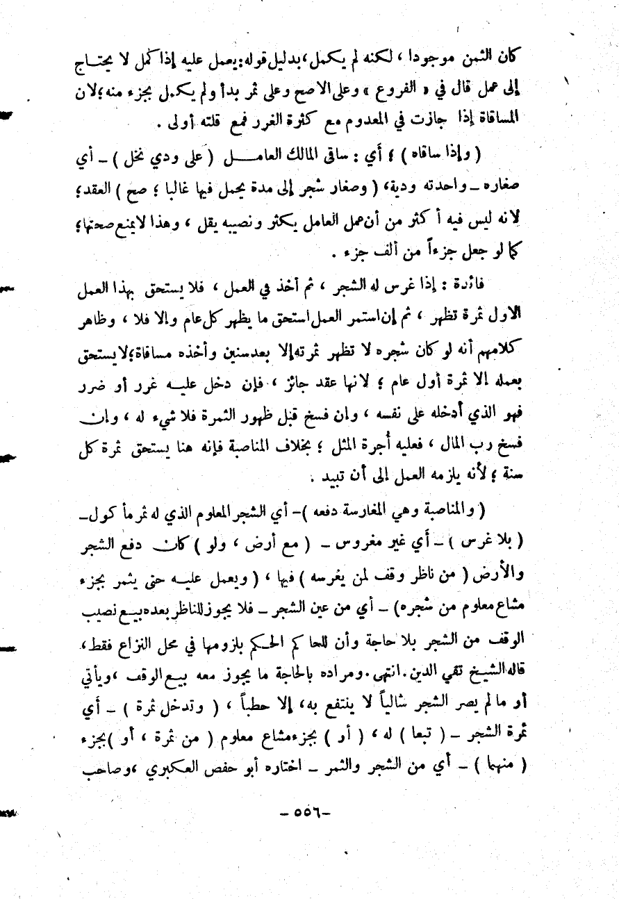 (وَالْمُنَاصَبَةُ وَهِيَ الْمُغَارَسَةُ دَفْعُهُ) - أَيْ الشَّجَرِ الْمَعْلُومِ الَّذِي لَهُ ثَمَرٌ مَأْكُولٌ - (بِلَا غَرْسٍ) أَيْ غَيْرَ مَغْرُوسٍ - (مَعَ أَرْضٍ، وَلَوْ) كَانَ دَفْعُ الشَّجَرِ وَالْأَرْضِ (مِنْ نَاظِرِ وَقْفٍ لِمَنْ يَغْرِسُهُ) فِيهَا، (وَيَعْمَلُ عَلَيْهِ حَتَّى يُثْمِرَ بِجُزْءٍ مُشَاعٍ مَعْلُومٍ مِنْ شَجَرِهِ) - أَيْ مِنْ عَيْنِ الشَّجَرِ - فَلَا يَجُوزُ لِلنَّاظِرِ بَعْدَهُ بَيْعُ نَصِيبِ الْوَقْفِ مِنْ الشَّجَرِ بِلَا حَاجَةٍ وَأَنَّ لِلْحَاكِمِ الْحُكْمَ بِلُزُومِهَا فِي مَحِلِّ النِّزَاعِ فَقَطْ، قَالَهُ الشَّيْخُ تَقِيُّ الدِّينِ. انْتَهَى. وَمُرَادُهُ بِالْحَاجَةِ مَا يَجُوزُ مَعَهُ بَيْعُ الْوَقْفِ، وَيَأْتِي أَوْ مَا لَمْ يَصِرْ الشَّجَرُ شَالِيًا لَا يُنْتَفَعُ بِهِ، إلَّا حَطَبًا، (وَتَدْخُلُ ثَمَرَةٌ) - أَيْ ثَمَرَةُ الشَّجَرِ - (تَبَعًا) لَهُ، (أَوْ) بِجُزْءٍ مُشَاعٍ مَعْلُومٍ (مِنْ ثَمَرَةٍ، أَوْ) بِجُزْءٍ (مِنْهُمَا) - أَيْ مِنْ الشَّجَرِ وَالثَّمَرِ - اخْتَارَهُ أَبُو حَفْصٍ الْعُكْبَرِيُّ، وَصَاحِبُ