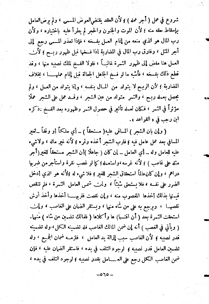شُرُوعٍ فِي عَمَلٍ (أَجْرُ عَمَلِهِ) ؛ لِأَنَّ الْعَقْدَ يَقْتَضِي الْعِوَضَ الْمُسَمَّى، وَلَمْ يَرْضَ الْعَامِلُ بِإِسْقَاطِ حَقِّهِ مِنْهُ؛ لِأَنَّ الْمَوْتَ وَالْجُنُونَ وَالْحَجْرَ لَمْ يَطْرَأْ عَلَيْهِ بِاخْتِيَارِهِ، وَلِأَنَّ رَبَّ الْمَالِ هُوَ الَّذِي مَنَعَهُ مِنْ إتْمَامِ الْعَمَلِ بِفَسْخِهِ، فَإِذَا تَعَذَّرَ الْمُسَمَّى رَجَعَ إلَى أَجْرِ الْمِثْلِ، وَفَارَقَ رَبَّ الْمَالِ فِي الْمُضَارَبَةِ إذَا فَسَخَهَا قَبْلَ ظُهُورٍ رِبْحٍ؛ لِأَنَّ الْعَمَلَ هُنَا مُفْضٍ إلَى ظُهُورِ الثَّمَرَةِ غَالِبًا، فَلَوْلَا الْفَسْخُ لَمَلَكَ نَصِيبَهُ مِنْهَا، وَقَدْ قَطَعَ ذَلِكَ بِفَسْخِهِ، فَأَشْبَهَ مَا لَوْ فَسَخَ الْجَاعِلُ الْجِعَالَةَ قَبْلَ إتْمَامِ عَمَلِهَا، بِخِلَافِ الْمُضَارَبَةِ؛ لِأَنَّ الرِّبْحَ لَا يَتَوَلَّدُ مِنْ الْمَالِ بِنَفْسِهِ، وَإِنَّمَا يَتَوَلَّدُ مِنْ الْعَمَلِ، وَلَمْ يَحْصُلْ بِعَمَلِهِ رِبْحٌ، وَالثَّمَرُ مُتَوَلَّدٌ مِنْ عَيْنِ الشَّجَرِ، وَقَدْ عَمِلَ عَلَى الشَّجَرِ عَمَلًا مُؤَثِّرًا فِي الثَّمَرِ، فَكَانَ لِعَمَلِهِ تَأْثِيرٌ فِي حُصُولِ الثَّمَرِ وَظُهُورِهِ بَعْدَ الْفَسْخِ. ذَكَرَهُ ابْنُ رَجَبٍ فِي " الْقَوَاعِدِ ".