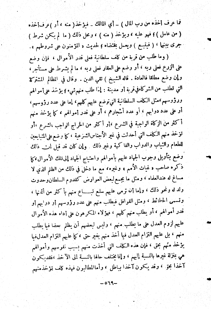 (وَمَا طُلِبَ مِنْ قُرْبَةٍ مِنْ كُلَفٍ سُلْطَانِيَّةٍ فَعَلَى قَدْرِ الْأَمْوَالِ، فَإِنْ وُضِعَ عَلَى الزَّرْعِ فَعَلَى رَبِّهِ، أَوْ وُضِعَ عَلَى الْعَقَارِ فَعَلَى رَبِّهِ، مَا لَمْ يُشْرَطْ عَلَى مُسْتَأْجِرٍ، وَإِنْ وُضِعَ مُطْلَقًا فَالْعَادَةُ. قَالَهُ الشَّيْخُ) تَقِيُّ الدِّينِ. وَقَالَ فِي الْمَظَالِمِ الْمُشْتَرَكَةِ الَّتِي تُطْلَبُ مِنْ الشُّرَكَاءِ فِي قَرْيَةٍ أَوْ مَدِينَةٍ: إذَا طُلِبَ مِنْهُمْ شَيْءٌ؛ يُؤْخَذُ عَلَى أَمْوَالِهِمْ وَرُءُوسِهِمْ، مِثْلُ الْكُلَفِ السُّلْطَانِيَّةِ الَّتِي تُوضَعُ عَلَيْهِمْ كُلِّهِمْ، إمَّا عَلَى عَدَدِ رُءُوسِهِمْ، أَوْ عَلَى عَدَدِ دَوَابِّهِمْ، أَوْ عَدَدِ أَشْجَارِهِمْ، أَوْ عَلَى قَدْرِ أَمْوَالِهِمْ، كَمَا يُؤْخَذُ مِنْهُمْ أَكْثَرُ مِنْ الزَّكَاةِ الْوَاجِبَةِ فِي الشَّرْعِ، أَوْ أَكْثَرُ مِنْ الْخَرَاجِ الْوَاجِبِ، بِالشَّرْعِ، أَوْ تُؤْخَذُ مِنْهُمْ الْكُلَفُ الَّتِي أُحْدِثَتْ فِي غَيْرِ الْأَجْنَاسِ الشَّرْعِيَّةِ، كَمَا وُضِعَ عَلَى الْمُتَبَايِعِينَ لِلطَّعَامِ وَالثِّيَابِ وَالدَّوَابِّ وَالْفَاكِهَةِ وَغَيْرِ ذَلِكَ. وَإِنْ كَانَ قَدْ قِيلَ إنَّ ذَلِكَ وُضِعَ بِتَأْوِيلِ وُجُوبِ الْجِهَادِ عَلَيْهِمْ بِأَمْوَالِهِمْ وَاحْتِيَاجِ الْجِهَادِ إلَى تِلْكَ الْأَمْوَالِ، كَمَا ذَكَرَهُ صَاحِبُ " غِيَاثِ الْأُمَمِ " وَغَيْرُهُ، مَعَ مَا دَخَلَ فِي ذَلِكَ مِنْ الظُّلْمِ الَّذِي لَا مَسَاغَ لَهُ عِنْدَ الْعُلَمَاءِ، وَمِثْلُ مَا يُجْمَعُ لِبَعْضِ الْعَوَارِضِ كَقُدُومِ السُّلْطَانِ وَحُدُوثِ وَلَدٍ لَهُ وَنَحْوِ ذَلِكَ، وَإِمَّا أَنْ تُرْمَى عَلَيْهِمْ سِلَعٌ تُبَاعُ مِنْهُمْ بِأَكْثَرَ مِنْ أَثْمَانِهَا، وَتُسَمَّى الْحَطَائِطَ، وَمِثْلُ الْقَوَافِلِ فَيُطْلَبُ مِنْهُمْ عَلَى عَدَدِ رُءُوسِهِمْ أَوْ دَوَابِّهِمْ أَوْ قَدْرِ أَمْوَالِهِمْ، أَوْ يُطْلَبُ مِنْهُمْ كُلِّهِمْ، فَهَؤُلَاءِ الْمُكْرَهُونَ عَلَى أَدَاءِ هَذِهِ الْأَمْوَالِ عَلَيْهِمْ لُزُومُ الْعَدْلِ عَلَى مَا يُطْلَبُ مِنْهُمْ، وَلَيْسَ لِبَعْضِهِمْ أَنْ يَظْلِمَ بَعْضًا فِيمَا يُطْلَبُ مِنْهُمْ، بَلْ عَلَيْهِمْ الْتِزَامُ الْعَدْلِ فِيمَا أُخِذَ مِنْهُمْ بِغَيْرِ حَقٍّ، كَمَا عَلَيْهِمْ الْتِزَامُ الْعَدْلِ فِيمَا يُؤْخَذُ مِنْهُمْ بِحَقٍّ، فَإِنَّ هَذِهِ الْكُلَفَ الَّتِي أُخِذَتْ مِنْهُمْ بِسَبَبِ نُفُوسِهِمْ وَأَمْوَالِهِمْ هِيَ بِمَنْزِلَةِ غَيْرِهَا بِالنِّسْبَةِ إلَيْهِمْ، وَإِنَّمَا يَخْتَلِفُ حَالُهَا بِالنِّسْبَةِ إلَى الْآخِذِ، فَقَدْ يَكُونُ آخِذًا بِحَقٍّ، وَقَدْ يَكُونُ آخِذًا بِبَاطِلٍ، وَأَمَّا الْمُطَالَبُونَ فَهَذِهِ كُلَفٌ تُؤْخَذُ مِنْهُمْ