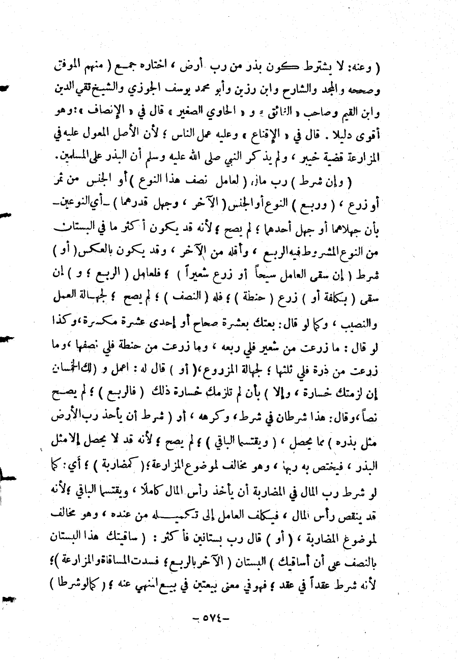 (أَوْ) شَرَطَ (إنْ سَقَى الْعَامِلُ سَيْحًا أَوْ زَرَعَ شَعِيرًا) ؛ فَلِعَامِلٍ (الرُّبْعُ؛ وَ) إنْ سَقَى (بِكُلْفَةٍ أَوْ) زَرَعَ (حِنْطَةً) ؛ فَلَهُ (النِّصْفُ) ؛ لَمْ يَصِحَّ؛ لِجَهَالَةِ الْعَمَلِ وَالنَّصِيبِ، وَكَمَا لَوْ قَالَ: بِعْتُكَ بِعَشَرَةٍ صِحَاحٍ أَوْ إحْدَى عَشْرَةَ مُكَسَّرَةً، وَكَذَا لَوْ قَالَ: مَا زَرَعْت مِنْ شَعِيرٍ فَلِي رُبْعُهُ، وَمَا زَرَعْت مِنْ حِنْطَةٍ فَلِي نِصْفُهَا، وَمَا زَرَعْت مِنْ ذُرَةٍ فَلِي ثُلُثُهَا؛ لِجَهَالَةِ الْمَزْرُوعِ.