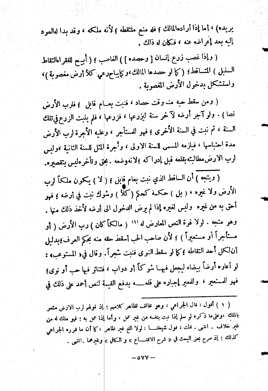 (وَمَنْ سَقَطَ حَبُّهُ مِنْهُ وَقْتَ حَصَادٍ، فَنَبَتَ بِعَامٍ قَابِلٍ؛ فَلِرَبِّ الْأَرْضِ نَصًّا) .