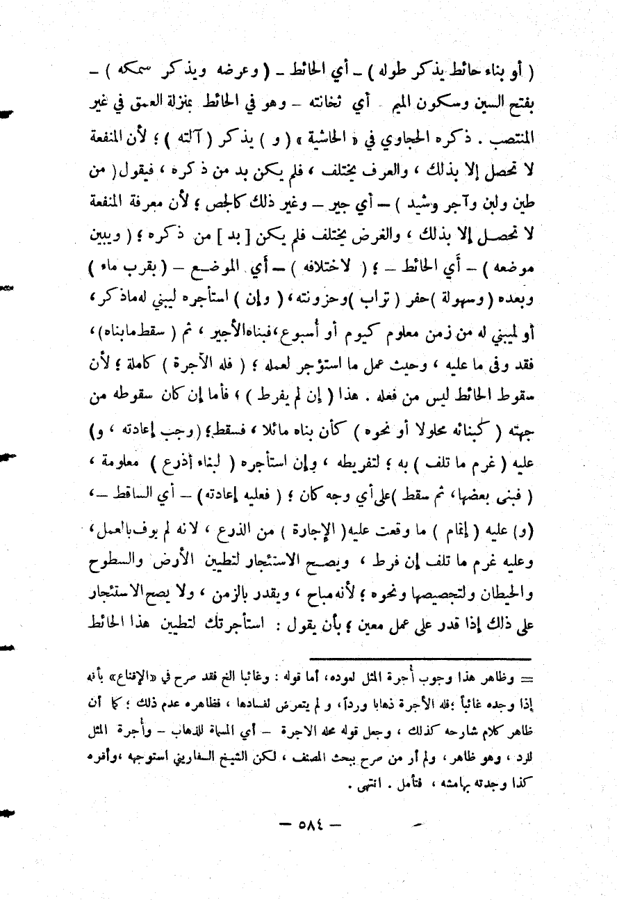 (أَوْ بِنَاءُ حَائِطٍ يَذْكُرُ طُولَهُ) - أَيْ الْحَائِطِ - (وَعَرْضَهُ وَيَذْكُرُ سَمْكَهُ) - بِفَتْحِ السِّينِ وَسُكُونِ الْمِيمِ أَيْ ثَخَانَتَهُ - وَهُوَ فِي الْحَائِطِ بِمَنْزِلَةِ الْعُمْقِ فِي غَيْرِ الْمُنْتَصِبِ.