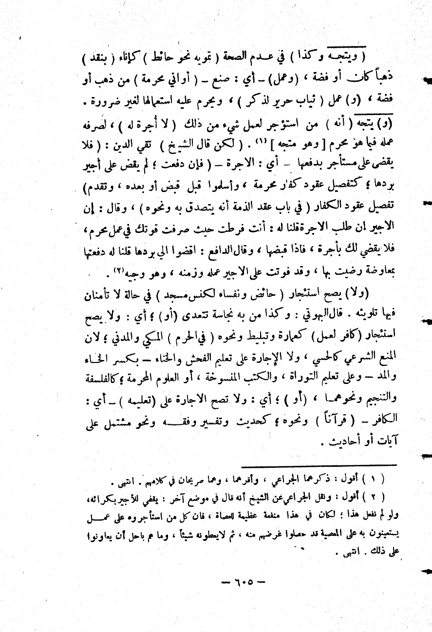 (أَوْ) ؛ أَيْ: وَلَا يَصِحُّ اسْتِئْجَارُ (كَافِرٍ لِعَمَلٍ) كَعِمَارَةٍ وَتَبْلِيطٍ وَنَحْوِهِ (فِي الْحَرَمِ) الْمَكِّيِّ وَالْمَدَنِيِّ؛ لِأَنَّ الْمَنْعَ الشَّرْعِيَّ كَالْحِسِّيِّ، وَلَا الْإِجَارَةِ عَلَى تَعْلِيمِ الْفُحْشِ وَالْخِنَاءِ - بِكَسْرِ الْخَاءِ وَالْمَدِّ - وَعَلَى تَعْلِيمِ التَّوْرَاةِ، وَالْكُتُبِ الْمَنْسُوخَةِ، أَوْ الْعُلُومِ الْمُحَرَّمَةِ، كَالْفَلْسَفَةِ وَالتَّنْجِيمِ وَنَحْوِهِمَا، (أَوْ) ؛ أَيْ: وَلَا تَصِحُّ الْإِجَارَةُ عَلَى (تَعْلِيمِهِ) - أَيْ: الْكَافِرِ - (قُرْآنًا) وَنَحْوَهُ؛ كَحَدِيثٍ وَتَفْسِيرٍ وَفِقْهٍ وَنَحْوٍ مُشْتَمِلٍ عَلَى آيَاتٍ أَوْ أَحَادِيثَ. .