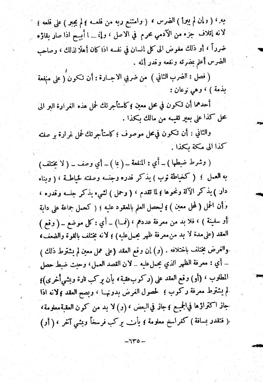 (فَصْلٌ) (الضَّرْبُ الثَّانِي) مِنْ ضَرْبَيْ الْإِجَارَةِ: أَنْ تَكُونَ (عَلَى مَنْفَعَةٍ بِذِمَّةٍ) ، وَهِيَ نَوْعَانِ: أَحَدُهُمَا أَنْ تَكُونَ فِي مَحَلٍّ مُعَيَّنٍ؛ كَاسْتَأْجَرْتُكَ لِحَمْلِ هَذِهِ الْغِرَارَةِ الْبُرِّ إلَى مَحَلِّ كَذَا عَلَى بَعِيرٍ تُقِيمُهُ مِنْ مَالِكَ بِكَذَا. وَالثَّانِي أَنْ تَكُونَ فِي مَحَلٍّ مَوْصُوفٍ؛ كَاسْتَأْجَرْتُكَ لِحَمْلِ غِرَارَةِ بُرٍّ صِفَتُهُ كَذَا إلَى مَكَّةَ بِكَذَا.