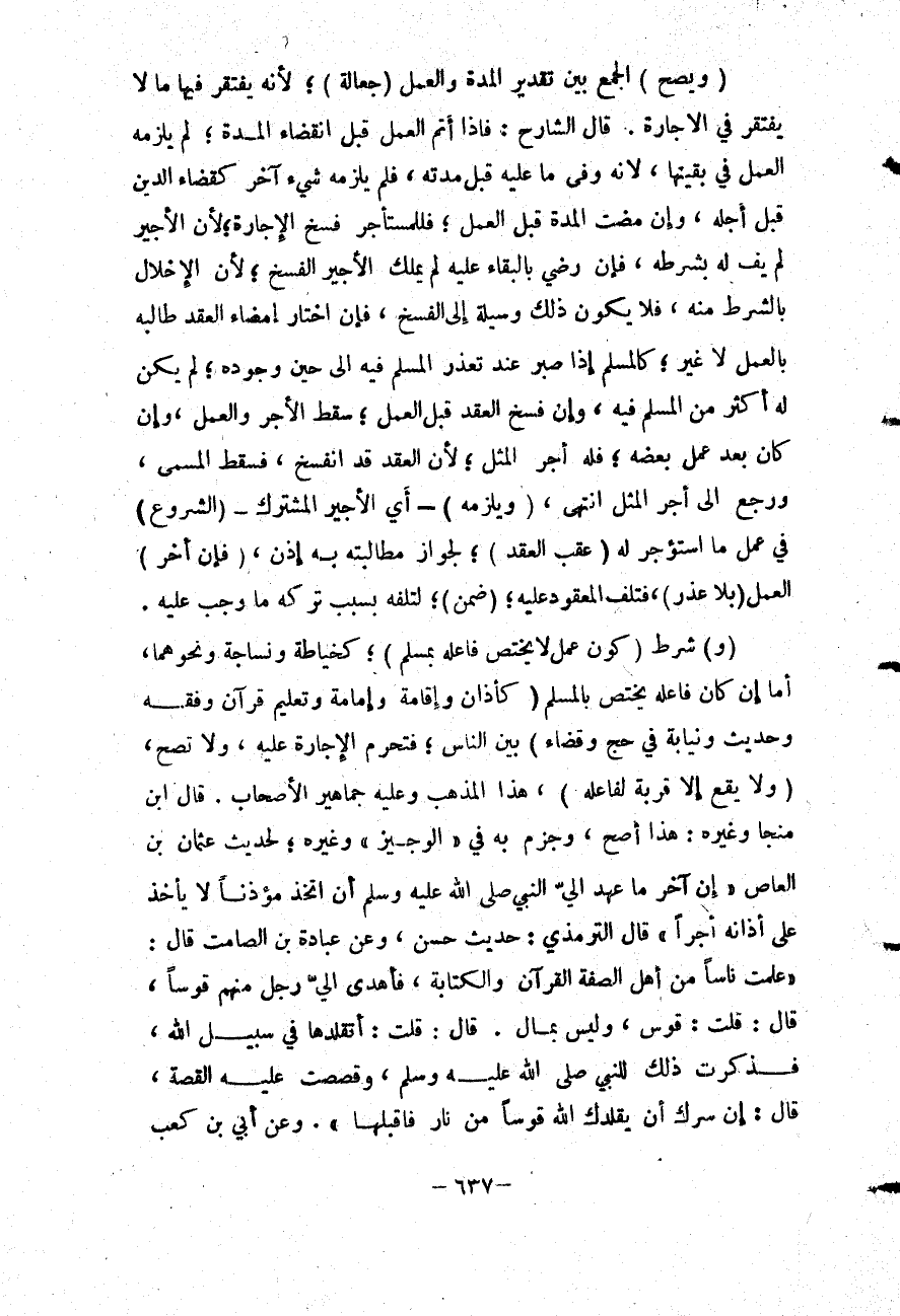 (وَ) وَشُرِطَ (كَوْنُ عَمَلٍ لَا يَخْتَصُّ فَاعِلُهُ بِمُسْلِمٍ) ؛ كَخِيَاطَةٍ وَنِسَاجَةٍ وَنَحْوِهِمَا، أَمَّا إنْ كَانَ فَاعِلُهُ يَخْتَصُّ بِالْمُسْلِمِ (كَأَذَانٍ وَإِقَامَةٍ وَإِمَامَةٍ وَتَعْلِيمِ قُرْآنٍ وَفِقْهٍ وَحَدِيثٍ وَنِيَابَةٍ فِي حَجٍّ وَقَضَاءٍ) بَيْنَ النَّاسِ؛ فَتَحْرُمُ الْإِجَارَةُ عَلَيْهِ. وَلَا تَصِحُّ، (وَلَا يَقَعُ إلَّا قُرْبَةً لِفَاعِلِهِ) ، هَذَا الْمَذْهَبُ وَعَلَيْهِ جَمَاهِيرُ الْأَصْحَابِ.