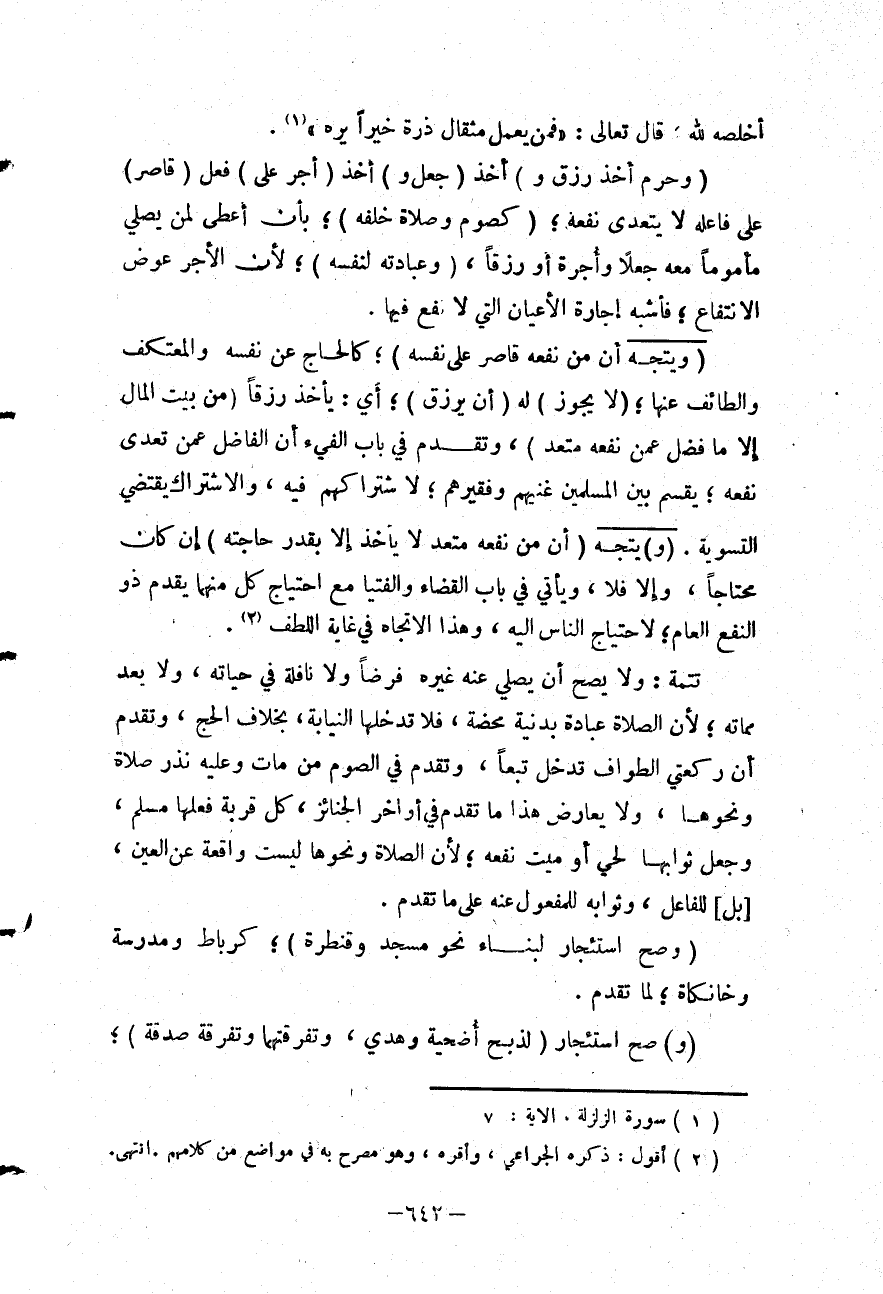 (وَيَتَّجِهُ أَنَّ مَنْ نَفْعُهُ قَاصِرٌ عَلَى نَفْسِهِ) ؛ كَالْحَاجِّ عَنْ نَفْسِهِ وَالْمُعْتَكِفِ وَالطَّائِفِ عَنْهَا؛ (لَا يَجُوزُ) لَهُ (أَنْ يُرْزَقَ) ؛ أَيْ: يَأْخُذَ رِزْقًا (مِنْ بَيْتِ الْمَالِ إلَّا مَا فَضَلَ عَمَّنْ نَفْعُهُ مُتَعَدٍّ) ، وَتَقَدَّمَ فِي بَابِ الْفَيْءِ أَنَّ الْفَاضِلَ عَمَّنْ تَعَدَّى نَفْعُهُ؛ يُقْسَمُ بَيْنَ الْمُسْلِمِينَ غَنِيِّهِمْ وَفَقِيرِهِمْ؛ لِاشْتِرَاكِهِمْ فِيهِ، وَالِاشْتِرَاكُ يَقْتَضِي التَّسْوِيَةَ.