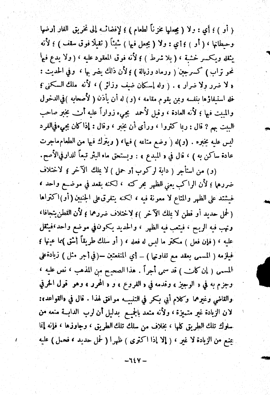 (وَ) مَنْ اسْتَأْجَرَ (دَابَّةً لِرُكُوبٍ أَوْ حَمْلٍ) لَا يَمْلِكُ الْآخَرَ؛ لِاخْتِلَافِ ضَرَرِهِمَا؛ لِأَنَّ الرَّاكِبَ يَعْنِي الظَّهْرَ بِحَرَكَتِهِ، لَكِنَّهُ يَقْعُدُ فِي مَوْضِعٍ وَاحِدٍ، فَيَشْتَدُّ عَلَى الظَّهْرِ وَالْمَتَاعِ لَا مَعُونَةَ فِيهِ، لَكِنَّهُ يَتَفَرَّقُ عَلَى الْجَنْبَيْنِ (أَوْ) اكْتَرَاهَا (لِحَمْلِ حَدِيدٍ أَوْ قُطْنٍ لَا يَمْلِكُ الْآخَرَ) ؛ لِاخْتِلَافِ ضَرَرِهِمَا؛ لِأَنَّ الْقُطْنَ يَتَجَافَى، وَتَهُبُّ فِيهِ الرِّيحُ، فَيَتْعَبُ فِيهِ الظَّهْرُ، وَالْحَدِيدُ يَكُونُ فِي مَوْضِعٍ وَاحِدٍ، فَيَثْقُلُ عَلَيْهِ، (فَإِنْ فَعَلَ) مُكْتِرٍ مَا لَيْسَ لَهُ فِعْلُهُ، (أَوْ سَلَكَ طَرِيقًا أَشَقَّ) مِمَّا عَيَّنَهَا؛ فَيَلْزَمُهُ (الْمُسَمَّى بِعَقْدٍ مَعَ تَفَاوُتِهِمَا) - أَيْ الْمَنْفَعَتَيْنِ - (فِي أَجْرِ مِثْلِ) زِيَادَةً عَلَى الْمُسَمَّى (إنْ كَانَ) قَدْ سَمَّى أَجْرًا. هَذَا الصَّحِيحُ مِنْ الْمَذْهَبِ، نَصَّ عَلَيْهِ، وَجَزَمَ بِهِ فِي " الْوَجِيزِ " وَقَدَّمَهُ فِي الْفُرُوعِ " " وَالْمُحَرَّرِ " وَهُوَ قَوْلُ الْخِرَقِيِّ وَالْقَاضِي وَغَيْرُهُمَا وَكَلَامُ أَبِي بَكْرٍ فِي التَّنْبِيهِ مُوَافِقٌ لِهَذَا.