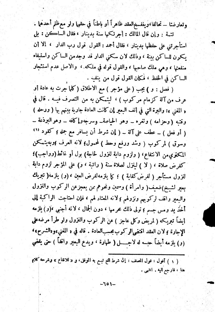 (فَصْلٌ: وَ) يَجِبُ (عَلَى مُؤَجِّرٍ) مَعَ الْإِطْلَاقِ (كُلَّمَا جَرَتْ بِهِ عَادَةٌ أَوْ عُرْفٌ مِنْ آلَةٍ كَزِمَامِ مَرْكُوبٍ) ، لِيَتَمَكَّنَ بِهِ مِنْ التَّصَرُّفِ فِيهِ. قَالَ فِي " الْمُغْنِي ": وَالْبَرَّةُ الَّتِي فِي أَنْفِ الْبَعِيرِ إنْ كَانَتْ الْعَادَةُ جَارِيَةً بَيْنَهُمْ بِهَا (وَرَحْلُهُ) وَقَتَبُهُ (وَحِزَامُهُ) وَثَغْرُهُ - وَهُوَ الْحِيَاصَةُ - وَسَرْجُهُ وَإِكَافُهُ - وَهُوَ الْبَرْذعَةُ - (أَوْ فِعْلٍ) - عُطِفَ عَلَى آلَةٍ - (إنْ شَرَطَ أَنْ يُسَافِرَ مَعَ جَمَلِهِ؛ كَقَوَدٍ وَسَوْقٍ) لِمَرْكُوبٍ (وَشَدٍّ وَرَفْعٍ وَحَطٍّ) لِمَحْمُولٍ؛ لِأَنَّهُ الْعُرْفُ؛ وَبِهِ يَتَمَكَّنُ الْمُكْتَرِي مِنْ الِانْتِفَاعِ، (وَلُزُومِ دَابَّةٍ لِنُزُولٍ لِحَاجَةِ) بَوْلٍ أَوْ غَائِطٍ (وَوَاجِبٍ) ؛ كَفَرْضِ صَلَاةٍ، (لَا) لِيَنْزِلَ لِصَلَاةِ سُنَّةٍ (رَاتِبَةٍ، وَ) عَلَى الْمُؤَجِّرِ لُزُومُ دَابَّةٍ لِنُزُولِ مُسْتَأْجِرٍ (لِفَرْضِ كِفَايَةٍ) ؛ كَمَا يَلْزَمُهُ لِفَرْضِ الْعَيْنِ، (وَ) يَلْزَمُهُ (تَبْرِيك بَعِيرٍ لِشَيْخٍ) ضَعِيفٍ (وَامْرَأَةٍ) وَسَمِينٍ وَنَحْوِهِمْ مِمَّنْ يَعْجَزُ عَنْ الرُّكُوبِ وَالنُّزُولِ وَالْبَعِيرُ وَاقِفٌ لِرُكُوبِهِمْ وَنُزُولِهِمْ؛ لِأَنَّهُ الْمُعْتَادُ لَهُمْ، فَإِنْ احْتَاجَتْ الرَّاكِبَةُ إلَى أَخْذِ يَدٍ وَمَسِّ جِسْمٍ؛ تَوَلَّى ذَلِكَ مَحْرَمُهَا، دُونَ الْجَمَّالِ، لِأَنَّهُ أَجْنَبِيٌّ، (وَ) يَلْزَمُهُ أَيْضًا تَبْرِيكُهُ (لِمَرِيضٍ وَكُلِّ عَاجِزٍ) عَنْ الرُّكُوبِ وَالنُّزُولِ وَلَوْ طَرَأَ مَرَضُهُ عَلَى الْإِجَارَةِ؛ لِأَنَّ الْعَقْدَ اقْتَضَى الرُّكُوبَ بِحَسَبِ الْعَادَةِ. قَالَهُ فِي " الْمُغْنِي " " وَالشَّرْحِ "، (وَ) يَلْزَمُهُ أَيْضًا حَبْسُهُ لَهُ لِأَجْلِ (طَهَارَةٍ، وَيَدَعُ الْبَعِيرَ وَاقِفًا) حَتَّى يَقْضِيَ