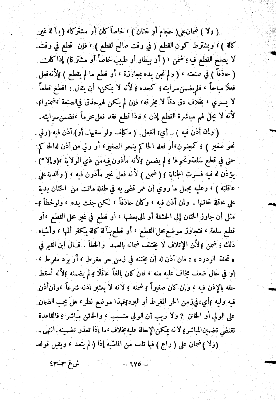 قَالَ ابْنُ الْقَيِّمِ فِي " تُحْفَةِ الْوَدُودِ ": فَإِنْ أَذِنَ لَهُ أَنْ يَخْتِنَهُ فِي زَمَنِ حَرٍّ مُفْرِطٍ، أَوْ بَرْدٍ مُفْرِطٍ، أَوْ فِي حَالِ ضَعْفٍ يُخَافُ عَلَيْهِ مِنْهُ، فَإِنْ كَانَ بَالِغًا عَاقِلًا؛ لَمْ يَضْمَنْهُ؛ لِأَنَّهُ أَسْقَطَ حَقَّهُ بِالْإِذْنِ فِيهِ، وَإِنْ كَانَ صَغِيرًا؛ ضَمِنَهُ؛ لِأَنَّهُ لَا يُعْتَبَرُ إذْنُهُ شَرْعًا، وَإِنْ أَذِنَ فِيهِ وَلِيُّهُ؛ أَيْ: فِي زَمَنِ الْحَرِّ الْمُفْرِطِ أَوْ الْبَرْدِ؛ فَهَذَا مَوْضِعُ نَظَرٍ، هَلْ يَجِبُ الضَّمَانُ عَلَى الْوَلِيِّ أَوْ الْخَاتِنِ؟ وَلَا رَيْبَ أَنَّ الْوَلِيَّ مُتَسَبِّبٌ، وَالْخَاتِنَ مُبَاشِرٌ؛ فَالْقَاعِدَةُ تَقْتَضِي تَضْمِينَ الْمُبَاشِرِ؛ لِأَنَّهُ يُمْكِنُ الْإِحَالَةُ عَلَيْهِ بِخِلَافِ، مَا إذَا تَعَذَّرَ تَضْمِينُهُ. انْتَهَى.