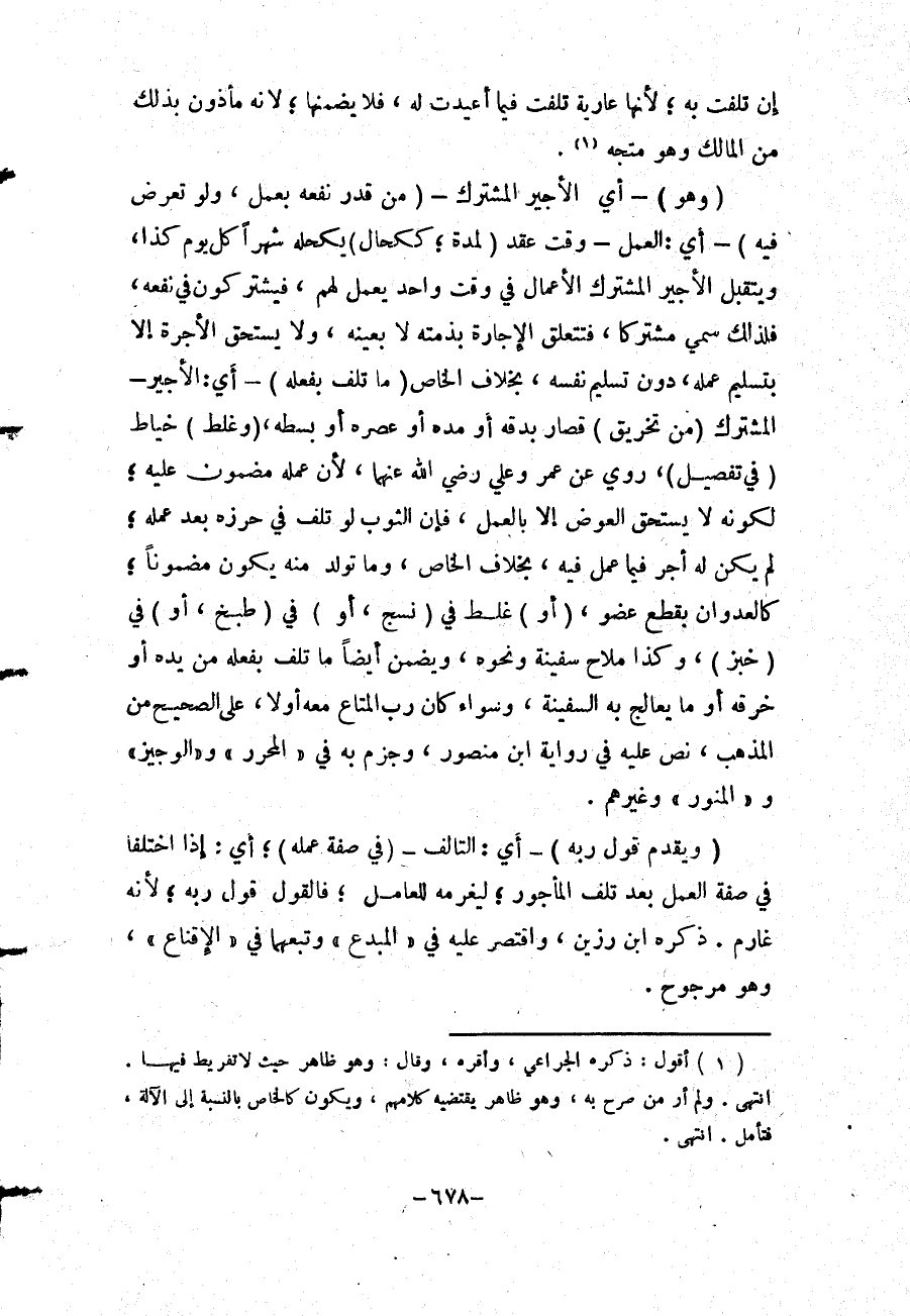 (وَهُوَ) - أَيْ الْأَجِيرُ الْمُشْتَرَكُ - (مَنْ قُدِّرَ نَفْعُهُ بِعَمَلٍ، وَلَوْ تَعَرَّضَ فِيهِ) - أَيْ: الْعَمَلُ - وَقْتَ عَقْدٍ (لِمُدَّةٍ؛ كَكَحَّالٍ) يُكَحِّلُهُ شَهْرًا كُلَّ يَوْمٍ كَذَا، وَيَتَقَبَّلُ الْأَجِيرُ الْمُشْتَرَكُ الْأَعْمَالَ فِي وَقْتٍ وَاحِدٍ يَعْمَلُ لَهُمْ، فَيَشْتَرِكُونَ فِي نَفْعِهِ، فَلِذَلِكَ سُمِّيَ مُشْتَرَكًا، فَتَتَعَلَّقُ الْإِجَارَةُ بِذِمَّتِهِ لَا بِعَيْنِهِ، وَلَا يَسْتَحِقُّ الْأُجْرَةَ إلَّا بِتَسْلِيمِ عَمَلِهِ، دُونَ تَسْلِيمِ نَفْسِهِ، بِخِلَافِ الْخَاصِّ (مَا تَلِفَ بِفِعْلِهِ) - أَيْ: الْأَجِيرُ - الْمُشْتَرَكُ (مِنْ تَخْرِيقِ) قَصَّارٍ بِدَقِّهِ أَوْ مَدِّهِ أَوْ عَصْرِهِ أَوْ بَسْطِهِ، (وَغَلَطِ) خَيَّاطٍ (فِي تَفْصِيلٍ) ، رُوِيَ عَنْ عُمَرَ وَعَلِيٍّ - رَضِيَ اللَّهُ عَنْهُمَا -، لِأَنَّ عَمَلَهُ مَضْمُونٌ عَلَيْهِ؛ لِكَوْنِهِ لَا يَسْتَحِقُّ الْعِوَضَ إلَّا بِالْعَمَلِ، فَإِنَّ الثَّوْبَ لَوْ تَلِفَ فِي حِرْزِهِ بَعْدَ عَمَلِهِ؛ لَمْ يَكُنْ لَهُ أَجْرٌ فِيمَا عَمَلَ فِيهِ، بِخِلَافِ الْخَاصِّ، وَمَا تَوَلَّدَ مِنْهُ يَكُونُ مَضْمُونًا؛ كَالْعُدْوَانِ بِقَطْعِ عُضْوٍ، (أَوْ) غَلَطٍ فِي (نَسْجٍ، أَوْ) فِي (طَبْخٍ، أَوْ) فِي (خَبْزٍ) ، وَكَذَا مَلَّاحُ سَفِينَةٍ وَنَحْوُهُ، وَيَضْمَنُ أَيْضًا مَا تَلِفَ بِفِعْلِهِ مِنْ يَدِهِ أَوْ خَرْقِهِ أَوْ مَا يُعَالِجُ بِهِ السَّفِينَةَ، وَسَوَاءٌ كَانَ رَبُّ الْمَتَاعِ مَعَهُ أَوْ لَا، عَلَى الصَّحِيحِ مِنْ الْمَذْهَبِ، نَصَّ عَلَيْهِ فِي رِوَايَةِ ابْنِ مَنْصُورٍ، وَجَزَمَ بِهِ فِي " الْمُحَرَّرِ " " وَالْوَجِيزِ " " وَالْمُنَوِّرِ " وَغَيْرِهِمْ.