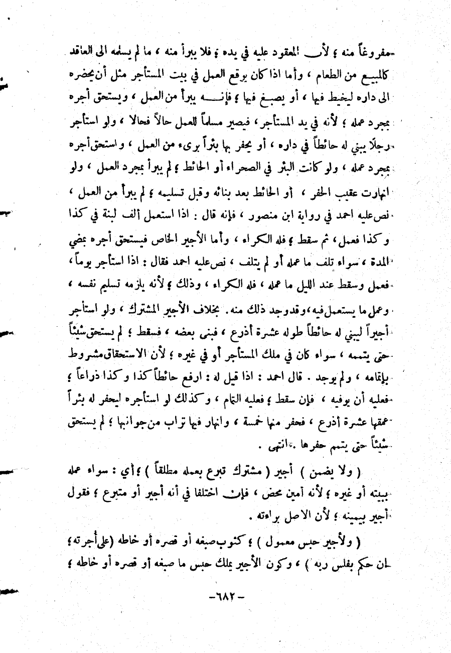 مَفْرُوغًا مِنْهُ؛ لِأَنَّ الْمَعْقُودَ عَلَيْهِ فِي يَدِهِ؛ فَلَا يَبْرَأُ مِنْهُ، مَا لَمْ يُسَلِّمْهُ إلَى الْعَاقِدِ كَالْمَبِيعِ مِنْ الطَّعَامِ، وَأَمَّا إذَا كَانَ يُوقِعُ الْعَمَلَ فِي بَيْتِ الْمُسْتَأْجِرِ مِثْلَ أَنْ يُحْضِرَهُ إلَى دَارِهِ لِيَخِيطَ فِيهَا، أَوْ يَصْبُغَ فِيهَا؛ فَإِنَّهُ يَبْرَأُ مِنْ الْعَمَلِ، وَيَسْتَحِقُّ أَجْرَهُ بِمُجَرَّدِ عَمَلِهِ؛ لِأَنَّهُ فِي يَدِ الْمُسْتَأْجِرِ، فَيَصِيرُ مُسَلِّمًا لِلْعَمَلِ حَالًّا فَحَالًّا، وَلَوْ اسْتَأْجَرَ رَجُلًا يَبْنِي لَهُ حَائِطًا فِي دَارِهِ، أَوْ يَحْفِرَ بِهَا بِئْرًا بَرِيءَ مِنْ الْعَمَلِ، وَاسْتَحَقَّ أَجْرَهُ بِمُجَرَّدِ عَمَلِهِ، وَلَوْ كَانَتْ الْبِئْرُ فِي الصَّحْرَاءِ أَوْ الْحَائِطِ؛ لَمْ يَبْرَأْ بِمُجَرَّدِ الْعَمَلِ، وَلَوْ انْهَارَتْ عَقِيبَ الْحَفْرِ، أَوْ الْحَائِطُ بَعْدَ بِنَائِهِ وَقَبْلَ تَسْلِيمِهِ؛ لَمْ يَبْرَأْ مِنْ الْعَمَلِ، نَصَّ عَلَيْهِ أَحْمَدُ فِي رِوَايَةِ ابْنِ مَنْصُورٍ، فَإِنَّهُ قَالَ: إذَا اسْتَعْمَلَ أَلْفَ لَبِنَةٍ فِي كَذَا وَكَذَا فَعَمَلَ، ثُمَّ سَقَطَ؛ فَلَهُ الْكِرَاءُ.