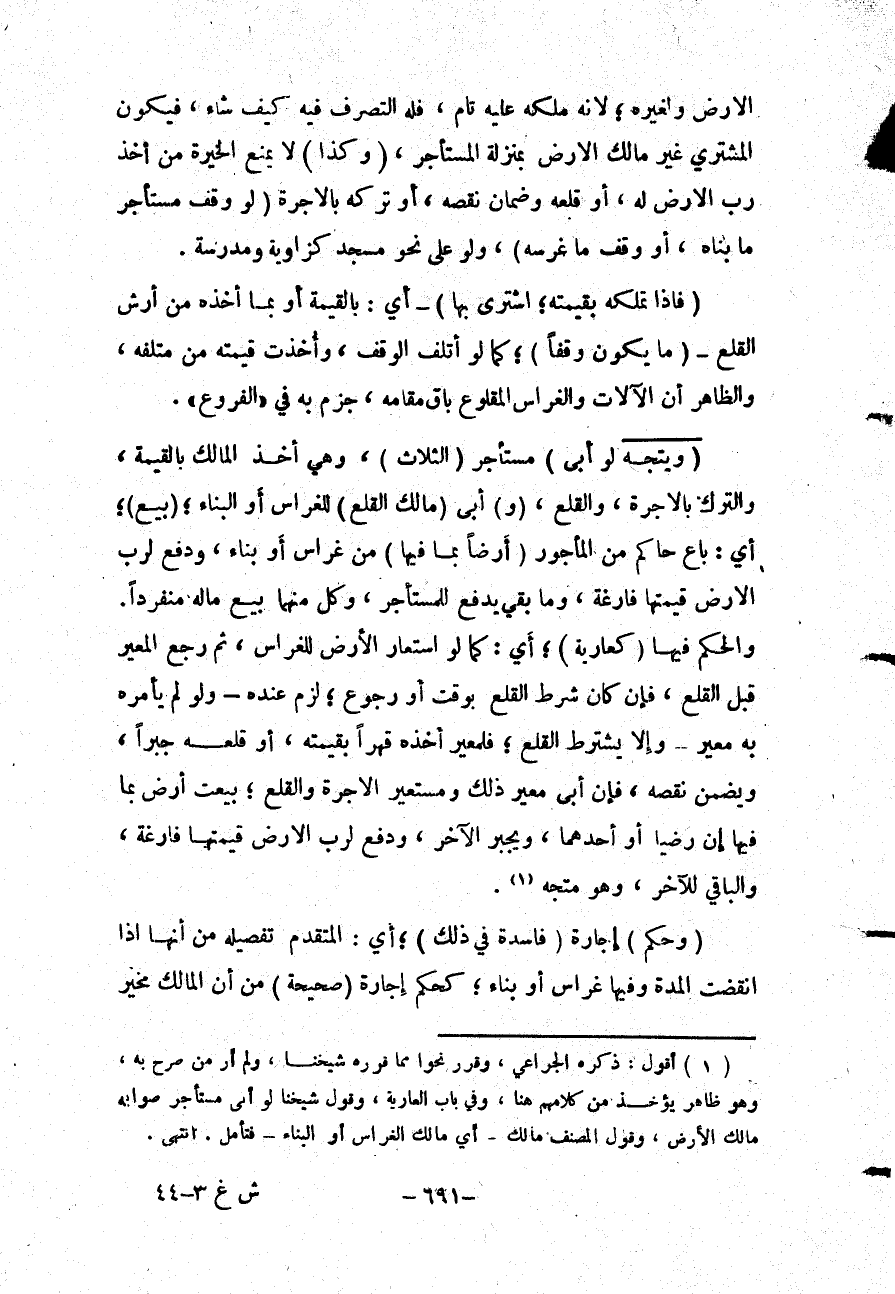(وَيَتَّجِهُ لَوْ أَبَى) مُسْتَأْجِرٌ (الثَّلَاثَ) ، وَهِيَ أَخْذُ الْمَالِكِ بِالْقِيمَةِ، وَالتَّرْكُ بِالْأُجْرَةِ، وَالْقَلْعُ، (وَ) أَبَى (مَالِكٌ الْقَلْعَ) لِلْغِرَاسِ أَوْ الْبِنَاءِ؛ (بِيعَ) ؛ أَيْ: بَاعَ حَاكِمٌ مِنْ الْمَأْجُورِ (أَرْضًا بِمَا فِيهَا) مِنْ غِرَاسٍ أَوْ بِنَاءٍ، وَدَفَعَ لِرَبِّ الْأَرْضِ قِيمَتَهَا فَارِغَةً، وَمَا بَقِيَ يُدْفَعُ لِلْمُسْتَأْجِرِ، وَكُلٌّ مِنْهُمَا بِيعَ مَالُهُ مُنْفَرِدًا.