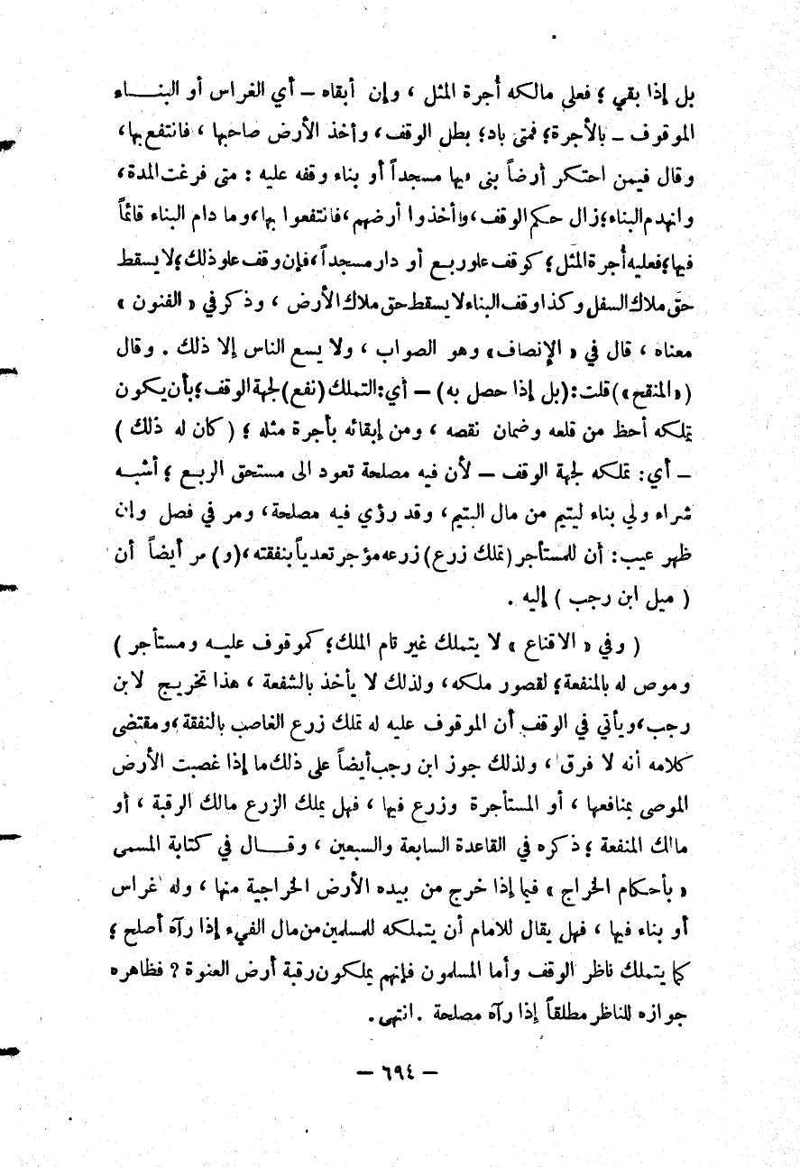 وَقَالَ فِي كِتَابِهِ الْمُسَمَّى " بِأَحْكَامِ الْخَرَاجِ ": فِيمَا إذَا خَرَجَ مَنْ بِيَدِهِ الْأَرْضُ الْخَرَاجِيَّةُ مِنْهَا، وَلَهُ غِرَاسٌ أَوْ بِنَاءٌ فِيهَا، فَهَلْ يُقَالُ لِلْإِمَامِ أَنْ يَتَمَلَّكَهُ لِلْمُسْلِمِينَ مِنْ مَالِ الْفَيْءِ إذَا رَآهُ أَصْلَحَ؟ كَمَا يَتَمَلَّكُ نَاظِرُ الْوَقْفِ. وَأَمَّا الْمُسْلِمُونَ فَإِنَّهُمْ يَمْلِكُونَ رَقَبَةَ أَرْضِ الْعَنْوَةِ؟ فَظَاهِرُهُ جَوَازُهُ لِلنَّاظِرِ مُطْلَقًا إذَا رَآهُ مَصْلَحَةً انْتَهَى.