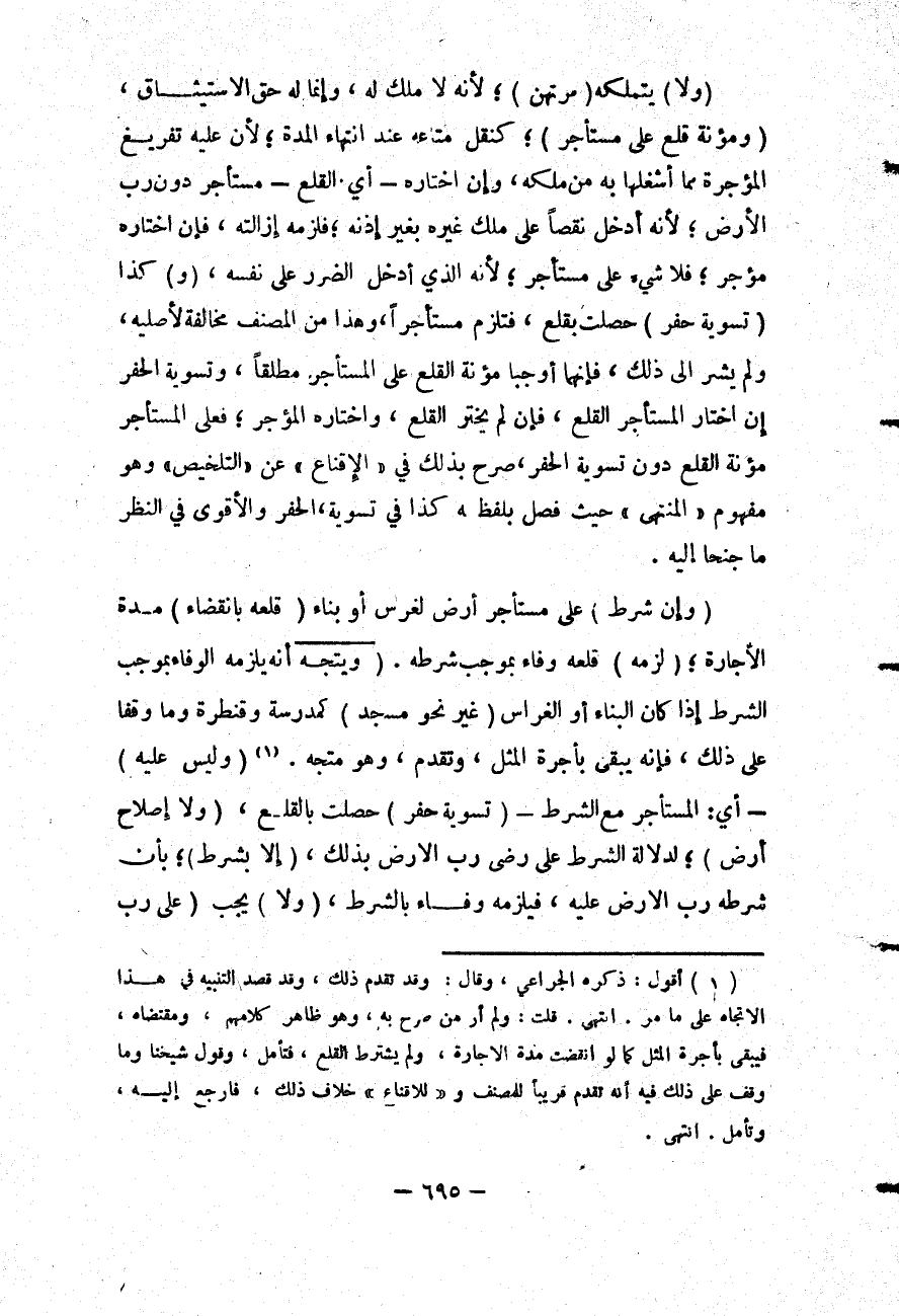 (وَيَتَّجِهُ) أَنَّهُ يَلْزَمُهُ الْوَفَاءُ بِمُوجِبِ الشَّرْطِ إذَا كَانَ الْبِنَاءُ أَوْ الْغِرَاسُ (غَيْرَ نَحْوِ مَسْجِدٍ) كَمَدْرَسَةٍ وَقَنْطَرَةٍ وَمَا وَقَفَا عَلَى ذَلِكَ، فَإِنَّهُ يَبْقَى بِأُجْرَةٍ الْمِثْلِ، وَتَقَدَّمَ، وَهُوَ مُتَّجِهٌ.