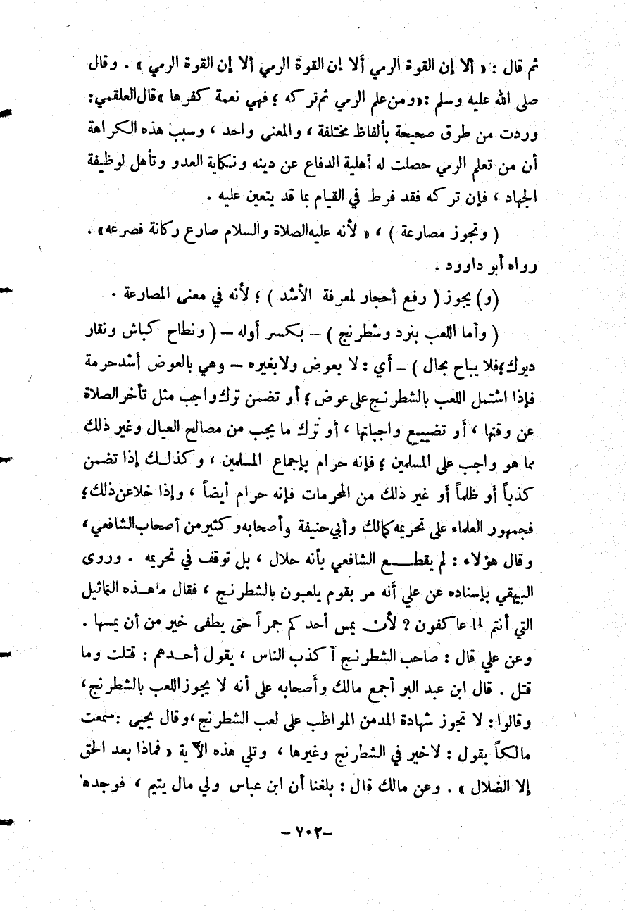 وَقَالَ - صَلَّى اللَّهُ عَلَيْهِ وَسَلَّمَ -: «وَمَنْ عَلِمَ الرَّمْيَ ثُمَّ تَرَكَهُ؛ فَهِيَ نِعْمَةٌ كَفَرَهَا» قَالَ الْعَلْقَمِيُّ: وَرَدَتْ مِنْ طُرُقٍ صَحِيحَةٍ بِأَلْفَاظٍ مُخْتَلِفَةٍ، وَالْمَعْنَى وَاحِدٌ، وَسَبَبُ هَذِهِ الْكَرَاهَةِ أَنَّ مَنْ تَعَلَّمَ الرَّمْيَ حَصَلَتْ لَهُ أَهْلِيَّةُ الدِّفَاعِ عَنْ دِينِهِ وَنِكَايَةُ الْعَدُوِّ وَتَأَهَّلَ لِوَظِيفَةِ الْجِهَادِ، فَإِنْ تَرَكَهُ فَقَدْ فَرَّطَ فِي الْقِيَامِ بِمَا قَدْ يَتَعَيَّنُ عَلَيْهِ.