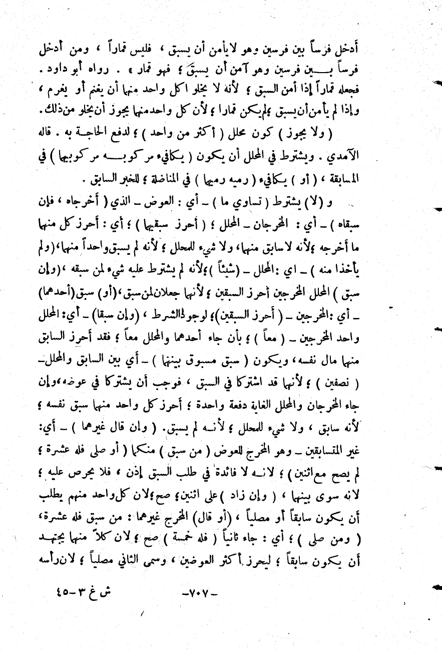 وَ (لَا) يُشْتَرَطُ (تَسَاوِي مَا) - أَيْ: الْعِوَضِ - الَّذِي (أَخْرَجَاهُ، فَإِنْ سَبَقَاهُ) - أَيْ: الْمُخْرِجَانِ - الْمُحَلِّلَ؛ (أَحْرَزَ سَبَقَيْهِمَا) ؛ أَيْ: أَحْرَزَ كُلٌّ مِنْهُمَا مَا أَخْرَجَهُ؛ لِأَنَّهُ لَا سَابِقَ مِنْهُمَا، وَلَا شَيْءَ لِلْمُحَلِّلِ؛ لِأَنَّهُ لَمْ يَسْبِقْ وَاحِدًا مِنْهُمَا، (وَلَمْ يَأْخُذَا مِنْهُ) - أَيْ: الْمُحَلِّلِ - (شَيْئًا) ؛ لِأَنَّهُ لَمْ يُشْتَ يُشْتَرَطْ عَلَيْهِ شَيْءٌ لِمَنْ سَبَقَهُ.
