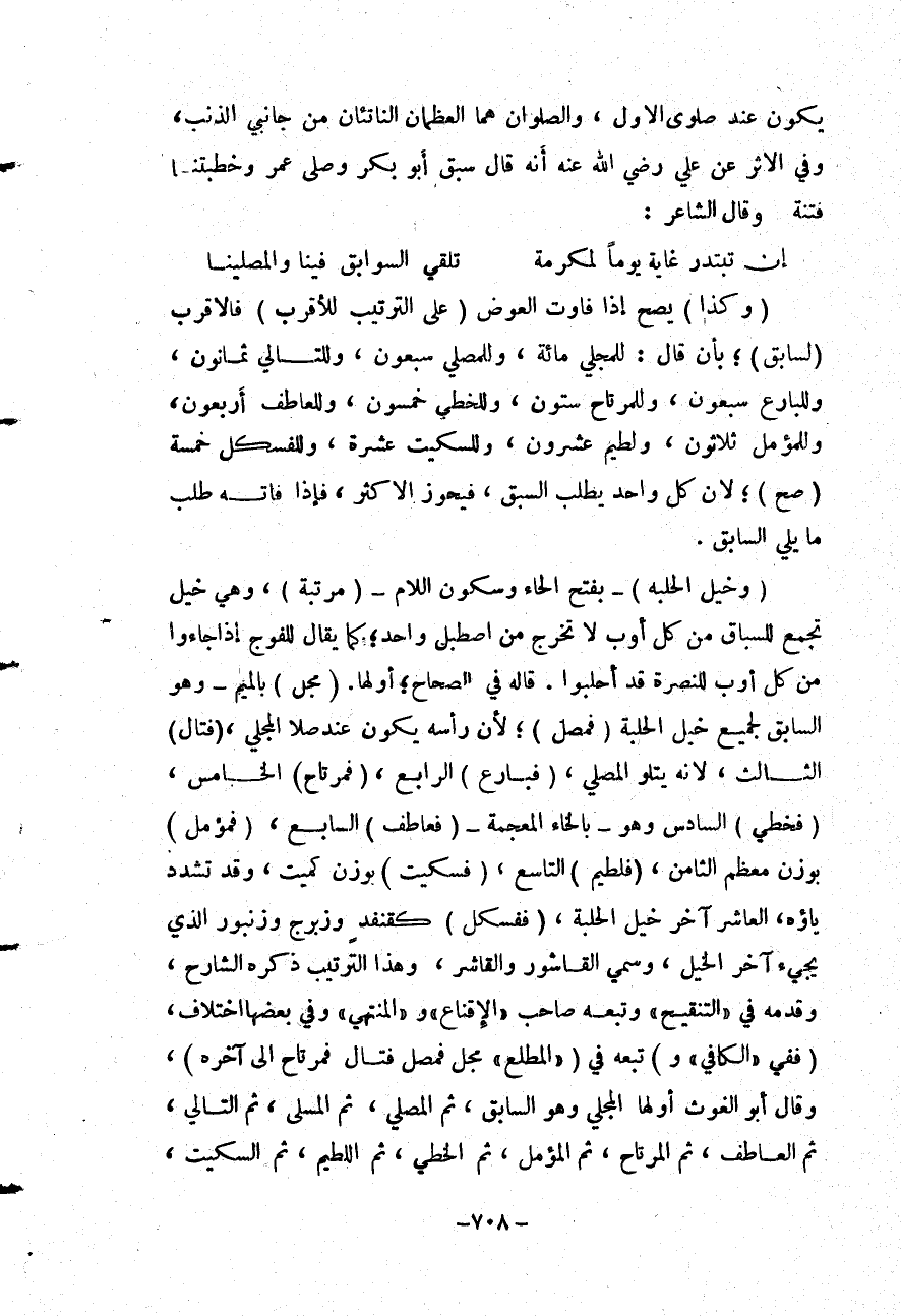 (مُجَلٌّ) بِالْمِيمِ - وَهُوَ السَّابِقُ لِجَمِيعِ خَيْلِ الْحَلْبَةِ (فَمُصَلٍّ) ؛ لِأَنَّ رَأْسَهُ يَكُونُ عِنْدَ صَلَا الْمُجِلِّي، (فَتَالٍ) الثَّالِثُ؛ لِأَنَّهُ يَتْلُو الْمُصَلِّي، (فَبَارِعٌ) الرَّابِعُ، (فَمُرْتَاحٌ) الْخَامِسُ، (فَخَطِّيٌّ) السَّادِسُ وَهُوَ - بِالْخَاءِ الْمُعْجَمَةِ - (فَعَاطِفٌ) السَّابِعُ، (فَمُؤَمَّلٌ) بِوَزْنِ مُعَظَّمٍ الثَّامِنُ، (فَلَطِيمٌ) التَّاسِعُ، (فَسُكَيْتٌ) بِوَزْنِ كُمَيْتٍ، وَقَدْ تُشَدَّدُ يَاؤُهُ، الْعَاشِرُ آخِرُ خَيْلِ الْحَلْبَةِ، (فَفُسْكُلٌ) كَقُنْفُذٍ وَزِبْرِجٍ وَزُنْبُورٍ الَّذِي يَجِيءُ آخِرَ الْخَيْلِ، وَسُمِّيَ الْقَاشُورَ وَالْقَاشِرَ، وَهَذَا التَّرْتِيبُ ذَكَرَهُ الشَّارِحُ، وَقَدَّمَهُ فِي " التَّنْقِيحِ " وَتَبِعَهُ صَاحِبُ " الْإِقْنَاعِ " " وَالْمُنْتَهَى " وَفِي بَعْضِهَا اخْتِلَافٌ، (فَفِي " الْكَافِي " وَ) تَبِعَهُ فِي (" الْمُطْلِعِ " مُجَلٌّ فَمُصَلٍّ فَتَالٍ فَمُرْتَاحٌ إلَى آخِرِهِ) ، وَقَالَ أَبُو الْغَوْثِ أَوَّلُهَا الْمُجِلِّي وَهُوَ السَّابِقُ، ثُمَّ الْمُصَلِّي، ثُمَّ الْمُسَلِّي، ثُمَّ التَّالِي، ثُمَّ الْعَاطِفُ، ثُمَّ الْمُرْتَاحُ، ثُمَّ الْمُؤَمَّلُ، ثُمَّ الْخَطِّيُّ، ثُمَّ اللَّطِيمُ، ثُمَّ السُّكَيْتُ،