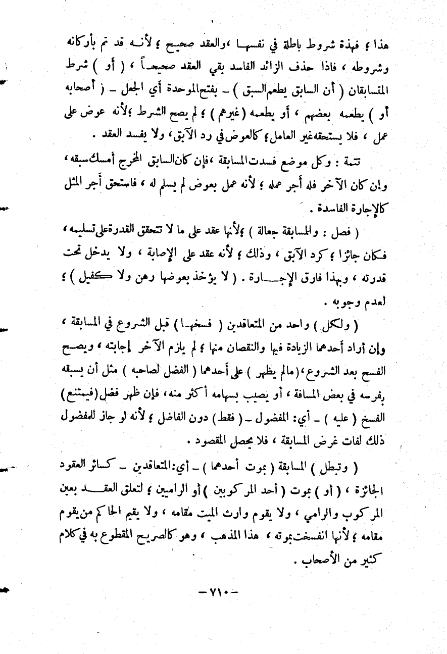 (وَلِكُلِّ) وَاحِدٍ مِنْ الْمُتَعَاقِدَيْنِ (فَسْخُهَا) قَبْلَ الشُّرُوعِ فِي الْمُسَابَقَةِ، وَإِنْ أَرَادَ أَحَدُهُمَا الزِّيَادَةَ فِيهَا وَالنُّقْصَانَ مِنْهَا؛ لَمْ يَلْزَمْ الْآخَرَ إجَابَتُهُ، وَيَصِحُّ الْفَسْخُ بَعْدَ الشُّرُوعِ، (مَا لَمْ يَظْهَرْ) عَلَى أَحَدِهِمَا (الْفَضْلُ لِصَاحِبِهِ) مِثْلُ أَنْ يَسْبِقَهُ بِفَرَسِهِ فِي بَعْضِ الْمَسَافَةِ، أَوْ يُصِيبَ بِسِهَامِهِ أَكْثَرَ مِنْهُ، فَإِنْ ظَهَرَ فَضْلٌ (فَيَمْتَنِعُ) الْفَسْخُ (عَلَيْهِ) - أَيْ: الْمَفْضُولِ - (فَقَطْ) دُونَ الْفَاضِلِ؛ لِأَنَّهُ لَوْ جَازَ لِلْمَفْضُولِ ذَلِكَ لَفَاتَ غَرَضُ الْمُسَابَقَةِ، فَلَا يَحْصُلُ الْمَقْصُودُ.