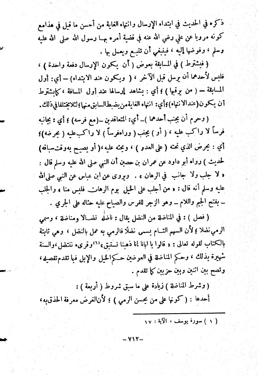 (فَصْلٌ) : فِي الْمُنَاضَلَةِ مِنْ النَّضْلِ يُقَالُ: نَاضَلَهُ نِضَالًا وَمُنَاضَلَةً، وَسُمِّيَ الرَّمْيُ نَضْلًا؛ لِأَنَّ السَّهْمَ التَّامَّ يُسَمَّى نَضْلًا فَالرَّمْيُ بِهِ عَمَلٌ بِالنَّضْلِ، وَهِيَ ثَابِتَةٌ بِالْكِتَابِ لِقَوْلِهِ تَعَالَى: {قَالُوا يَا أَبَانَا إِنَّا ذَهَبْنَا نَسْتَبِقُ} [يوسف: 17] وَقُرِئَ نَنْتَضِلُ، وَالسُّنَّةُ شَهِيرَةٌ بِذَلِكَ، وَحُكْمُ الْمُنَاضَلَةِ فِي الْعِوَضَيْنِ حُكْمُ الْخَيْلِ وَالْإِبِلِ فِيمَا تَقَدَّمَ تَفْصِيلُهُ، وَتَصِحُّ بَيْنَ اثْنَيْنِ وَبَيْنَ حِزْبَيْنِ كَمَا تَقَدَّمَ.
