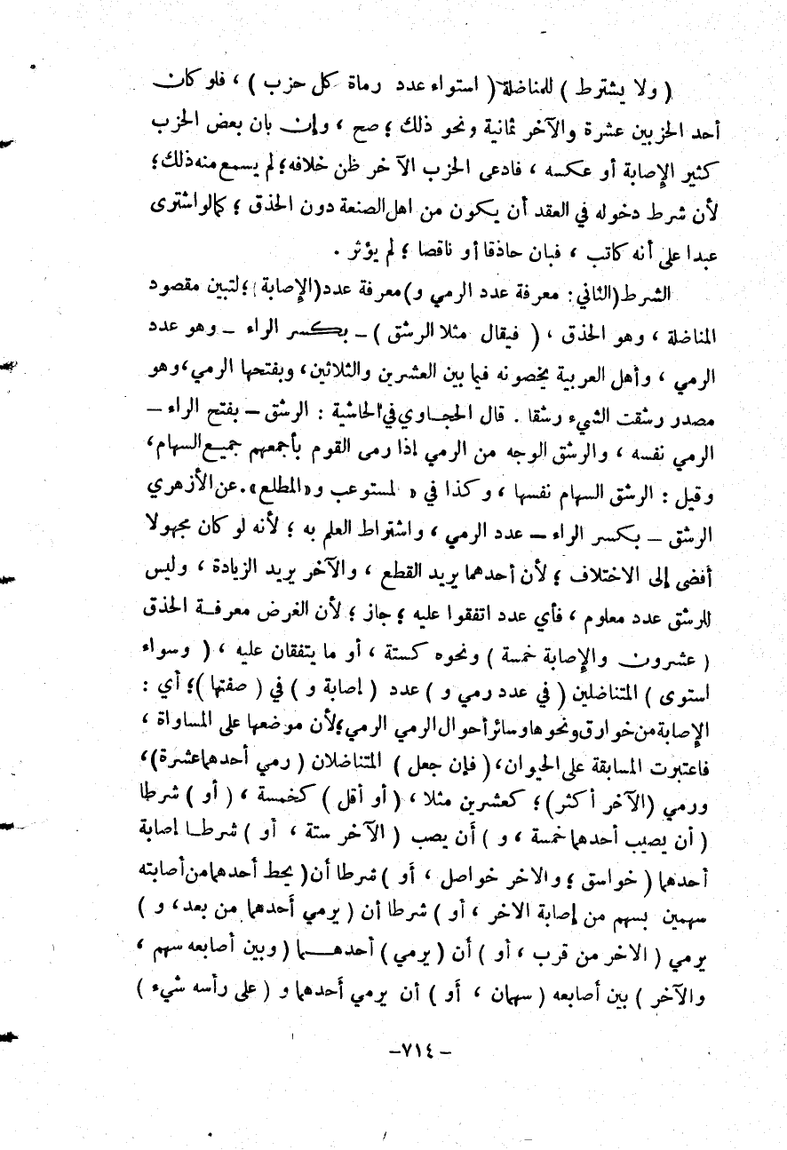 الشَّرْطُ (الثَّانِي مَعْرِفَةُ عَدَدِ الرَّمْيِ وَ) مَعْرِفَةُ عَدَدِ (الْإِصَابَةِ) ؛ لِتَبَيُّنِ مَقْصُودِ الْمُنَاضَلَةِ، وَهُوَ الْحِذْقُ (فَيُقَالُ مَثَلًا: الرِّشْقُ) - بِكَسْرِ الرَّاءِ -: وَهُوَ عَدَدُ الرَّمْيِ، وَأَهْلُ الْعَرَبِيَّةِ يَخُصُّونَهُ فِيمَا بَيْنَ الْعِشْرِينَ وَالثَّلَاثِينَ، وَبِفَتْحِهَا الرَّمْيُ، وَهُوَ مَصْدَرُ رَشَقْتُ الشَّيْءَ رَشْقًا قَالَ الْحَجَّاوِيُّ فِي الْحَاشِيَةِ: الرَّشْقُ - بِفَتْحِ الرَّاءِ -: الرَّمْيُ نَفْسُهُ، وَالرَّشْقُ الْوَجْهُ مِنْ الرَّمْيِ إذَا رَمَى الْقَوْمُ بِأَجْمَعِهِمْ جَمِيعَ السِّهَامِ، وَقِيلَ: الرَّشْقُ: السِّهَامُ نَفْسُهَا، وَكَذَا فِي " الْمُسْتَوْعِبِ وَالْمُطْلِعِ " عَنْ الْأَزْهَرِيِّ: الرِّشْقُ - بِكَسْرِ الرَّاءِ -: عَدَدُ الرَّمْيِ، وَاشْتِرَاطُ الْعِلْمِ بِهِ؛ لِأَنَّهُ لَوْ كَانَ مَجْهُولًا أَفْضَى إلَى الِاخْتِلَافِ؛ لِأَنَّ أَحَدَهُمَا يُرِيدُ الْقَطْعَ، وَالْآخَرُ يُرِيدُ الزِّيَادَةَ، وَلَيْسَ لِلرِّشْقِ عَدَدٌ مَعْلُومٌ، فَأَيَّ عَدَدٍ اتَّفَقُوا عَلَيْهِ؛ جَازَ؛ لِأَنَّ الْغَرَضَ مَعْرِفَةُ الْحِذْقِ (عِشْرُونَ وَالْإِصَابَةُ خَمْسَةٌ) وَنَحْوُهُ كَسِتَّةٍ، أَوْ مَا يَتَّفِقَانِ عَلَيْهِ، (وَسَوَاءٌ اسْتَوَى) الْمُتَنَاضَلَيْنِ (فِي عَدَدِ رَمْيٍ وَ) عَدَدِ (إصَابَةٍ وَ) فِي (صِفَتِهَا) ؛ أَيْ: الْإِصَابَةِ مِنْ خَوَارِقَ وَنَحْوِهَا وَسَائِرِ أَحْوَالِ الرَّمْيِ؛ لِأَنَّ مَوْضِعَهَا عَلَى الْمُسَاوَاةِ، فَاعْتُبِرَتْ الْمُسَابَقَةُ عَلَى الْحَيَوَانِ، (فَإِنْ جَعَلَ) الْمُتَنَاضِلَانِ (رَمْيَ أَحَدِهِمَا عَشَرَةً) ، وَرَمْيَ (الْآخَرِ أَكْثَرَ) ؛ كَعِشْرِينَ مَثَلًا، (أَوْ أَقَلَّ) كَخَمْسَةٍ، (أَوْ) شَرَطَا (أَنْ يُصِيبَ أَحَدُهُمَا خَمْسَةً، وَ) أَنْ يُصِيبَ (الْآخَرُ سِتَّةً، أَوْ) شَرَطَا إصَابَةَ أَحَدِهِمَا (خَوَاسِقُ؛ وَالْآخَرُ خَوَاصِلُ، أَوْ) شَرَطَا أَنْ (يَحُطَّ أَحَدُهُمَا مِنْ إصَابَتِهِ سَهْمَيْنِ بِسَهْمٍ مِنْ إصَابَةِ الْآخَرِ، أَوْ) شَرَطَا أَنْ (يَرْمِيَ أَحَدُهُمَا مِنْ بُعْدٍ، وَ) يَرْمِيَ (الْآخَرُ مِنْ قُرْبٍ، أَوْ) أَنْ (يَرْمِيَ) أَحَدُهُمَا (وَبَيْنَ أَصَابِعِهِ سَهْمٌ، وَالْآخَرُ) بَيْنَ أَصَابِعِهِ (سَهْمَانِ، أَوْ) أَنْ يَرْمِيَ أَحَدُهُمَا وَ (عَلَى رَأْسِهِ شَيْءٌ)
