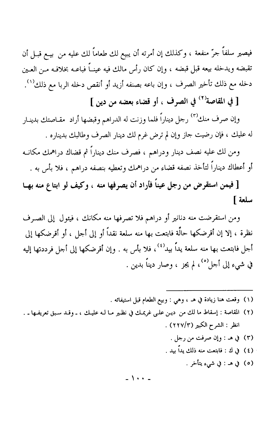 2502 - ومن استقرضت منه دنانير أو دراهم فلا تصرفها منك مكانك، فيئول إلى الصرف نظرة، إلا أن أقرضكها حالّة فابتعت بها منه سلعة نقداً أو إلى أجل، أو أقرضكها إلى أجل فابتعت بها منه سلعة يداً بيد، فلا بأس به. وإن أقرضكها إلى أجل فرددتها إليه في شيء إلى أجل، لم يجز، وصار ديناً بدين.