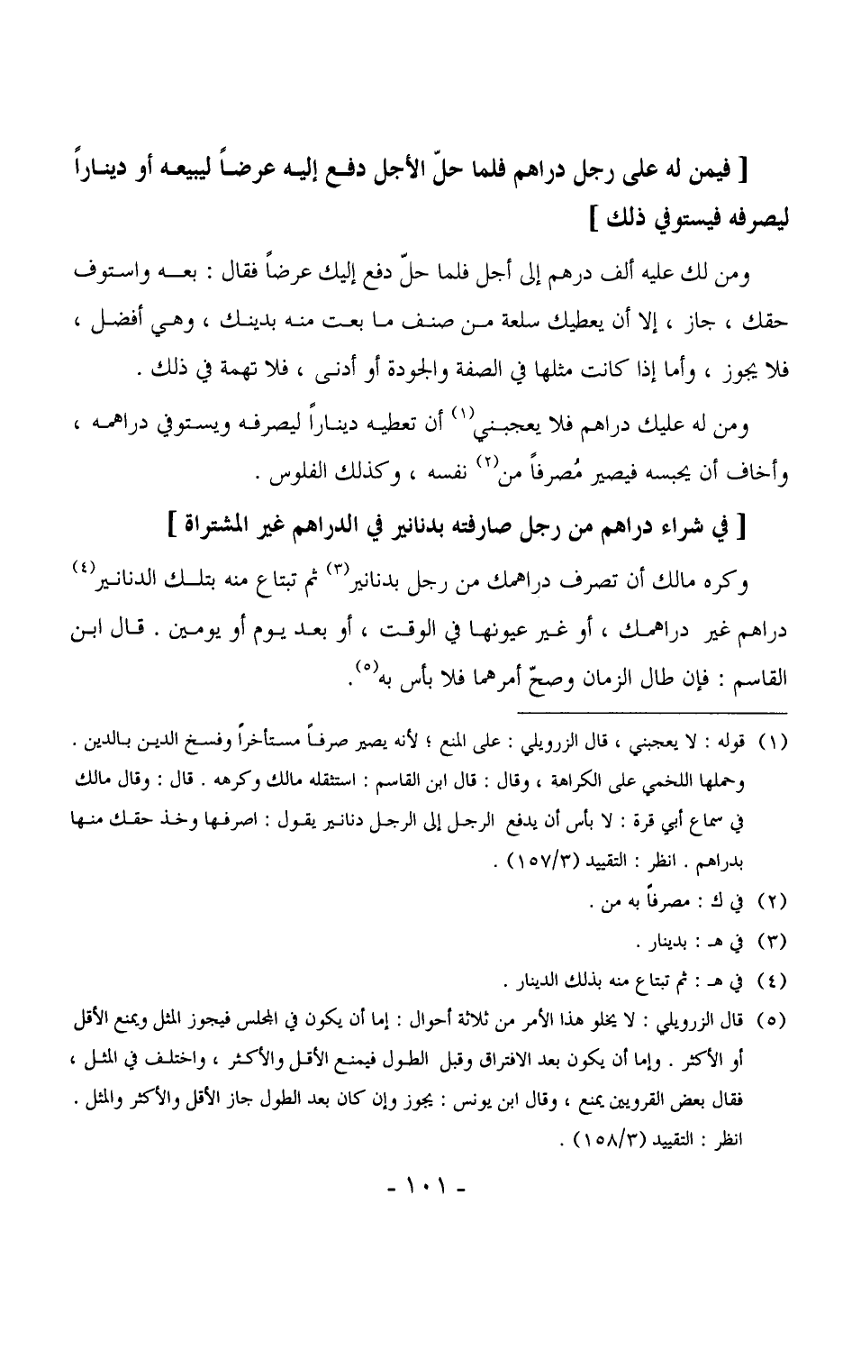 2503 - ومن لك عليه ألف درهم إلى أجل فلما حلّ دفع إليك عرضاً فقال: بعه واستوف حقك، جاز، إلا أن يعطيك سلعة من صنف ما بعت منه بدينك، وهي أفضل، فلا يجوز، وأما إذا كانت مثلها في الصفة والجودة أو أدنى، فلا تهمة في ذلك.