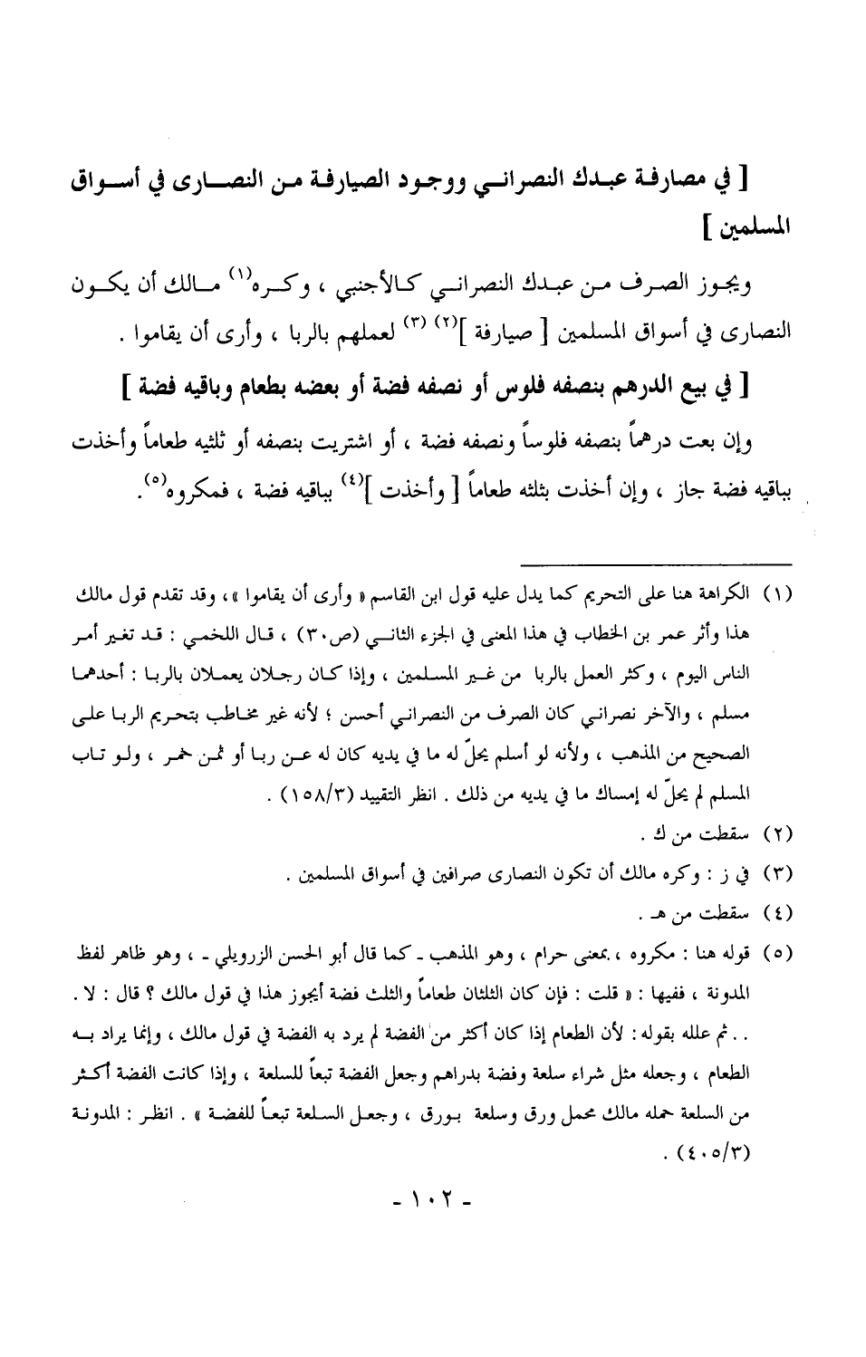 2505 - ويجوز الصرف من عبدك النصراني كالأجنبي، وكره مالك أن يكون النصارى في أسواق المسلمين [صيارفة] لعملهم بالربا، وارى أن يقاموا.