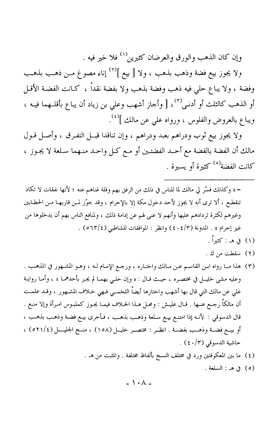 ولا يجوز بيع فضة وذهب بذهب، ولا [بيع] إناء مصوغ من ذهب بذهب وفضة، ولا يباع حلي فيه ذهب وفضة بذهب ولا بفضة نقداً، كانت الفضة الأقل أو الذهب كالثلث أو أدنى، [وأجاز أشهب وعلي بن زياد أن يباع بأقلهما فيه، ويباع بالعروض والفلوس، ورواه علي عن مالك] .
