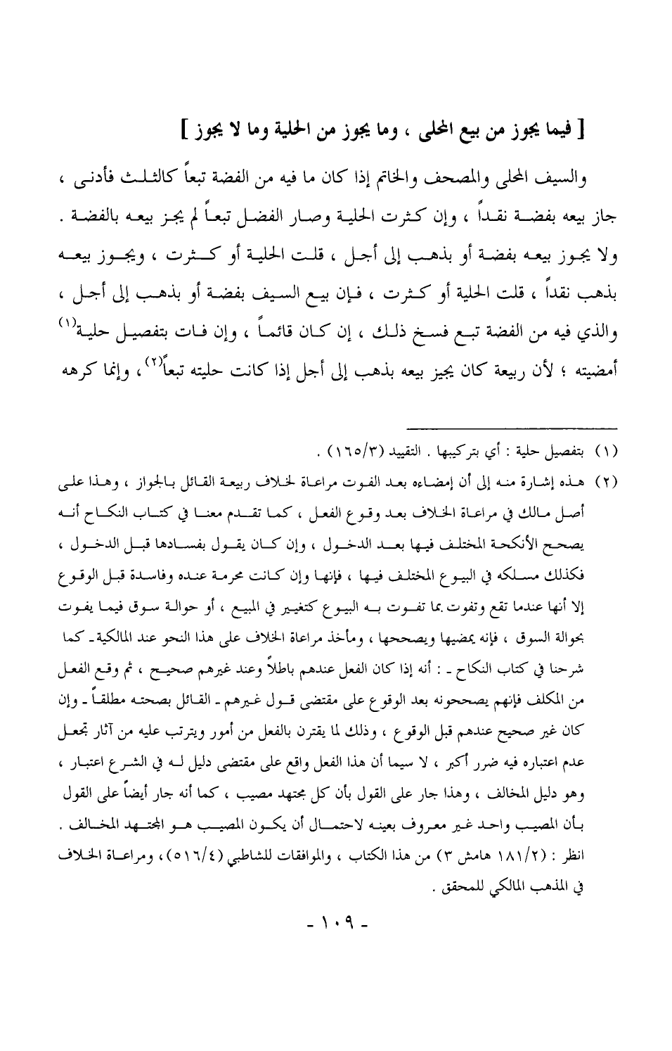 2517 - والسيف المحلى والمصحف والخاتم إذا كان ما فيه من الفضة تبعاً كالثلث فأدنى، جاز بيعه بفضة نقداً، وإن كثرت الحلية وصار الفضل تبعاً لم يجز بيعه بالفضة. ولا يجوز بيعه بفضة أو بذهب إلى أجل، قلت الحلية أو كثرت، ويجوز بيعه بذهب نقداً، قلت الحلية أو كثرت، فإن بيع السيف بفضة أو بذهب إلى أجل، والذي فيه من الفضة تبع فسخ ذلك، إن كان قائماً، وإن فات بتفصيل حلية أمضيته، لأن ربيعة كان يجيز بيعه بذهب إلى أجل إذا كانت حليته تبعاً، وإنما كرهه