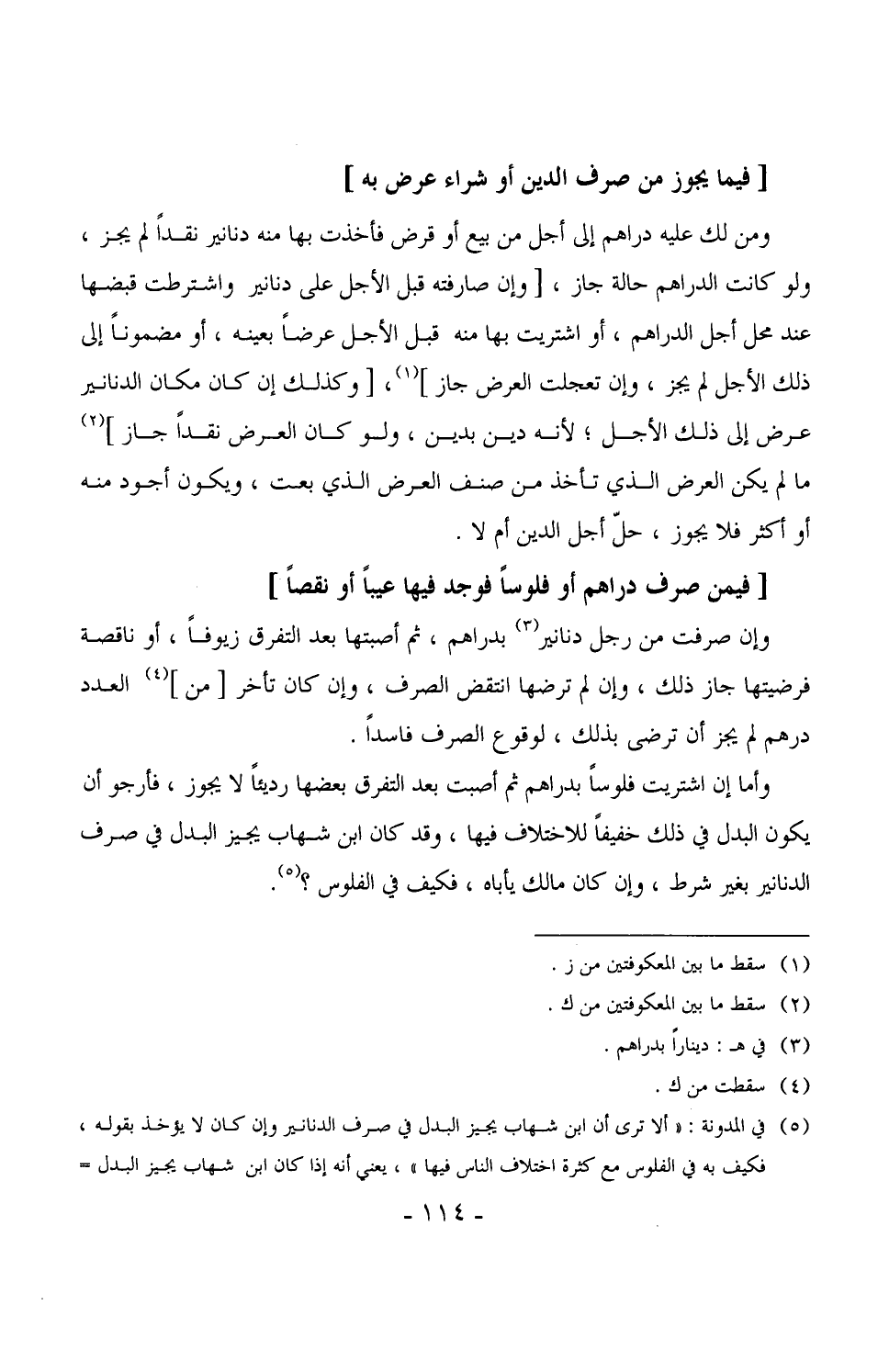 وأما إن اشتريت فلوساً بدراهم ثم أصبت بعد التفرق بعضها رديئاً لا يجوز، فأرجو أن يكون البدل في ذلك خفيفاً للاختلاف فيها، وقد كان ابن شهاب يجيز البدل في صرف الدنانير بغير شرط، وإن كان مالك يأباه، فكيف في الفلوس؟.